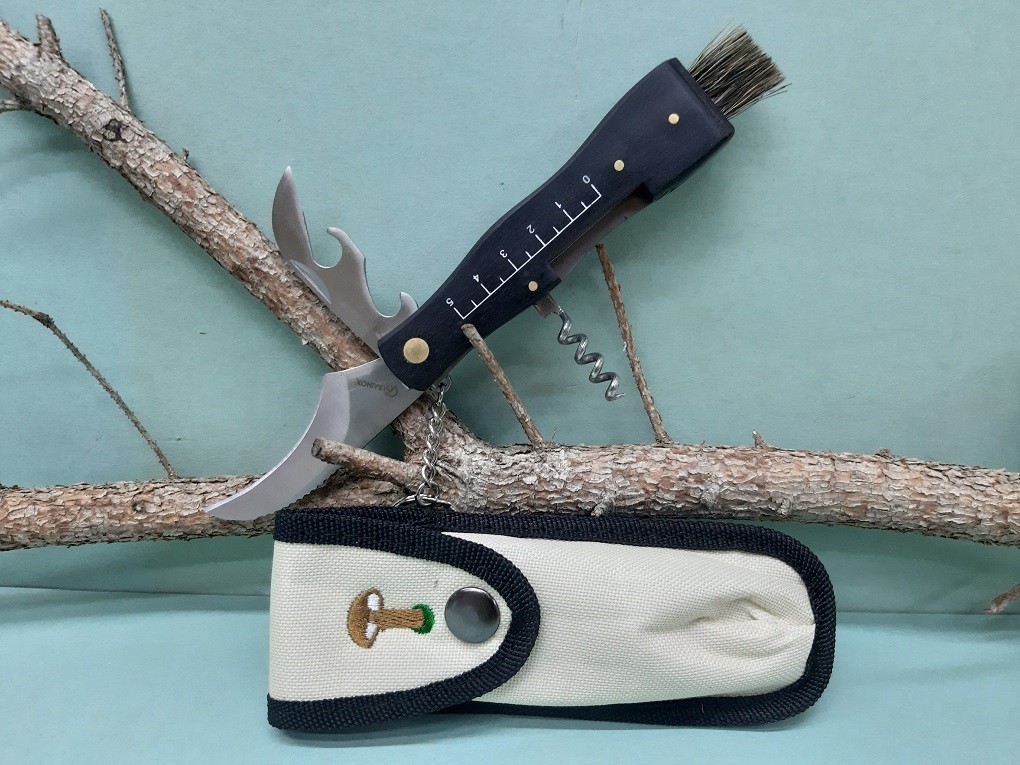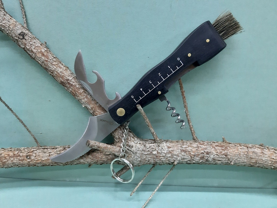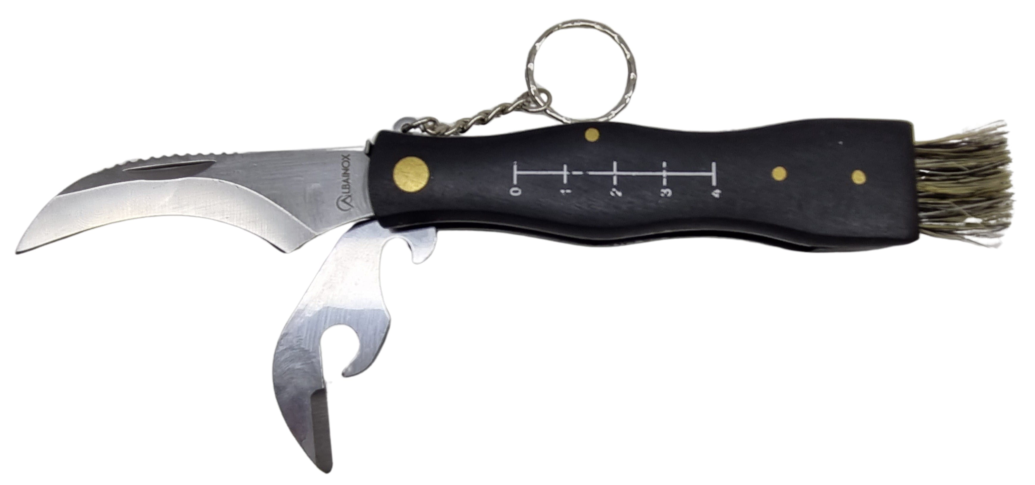 Zatvárací hubársky vreckový nôž Albainox s nerezovou zakrivenou čepeľou, drevenou rukoväťou s meracou stupnicou, vývrtkou, pinzetou, kefou na čistenie, otváračom na fľaše a konzervy a kľúčenkou. Dodáva sa spolu s nylonovým puzdrom. Dĺžka noža 21/8cm.