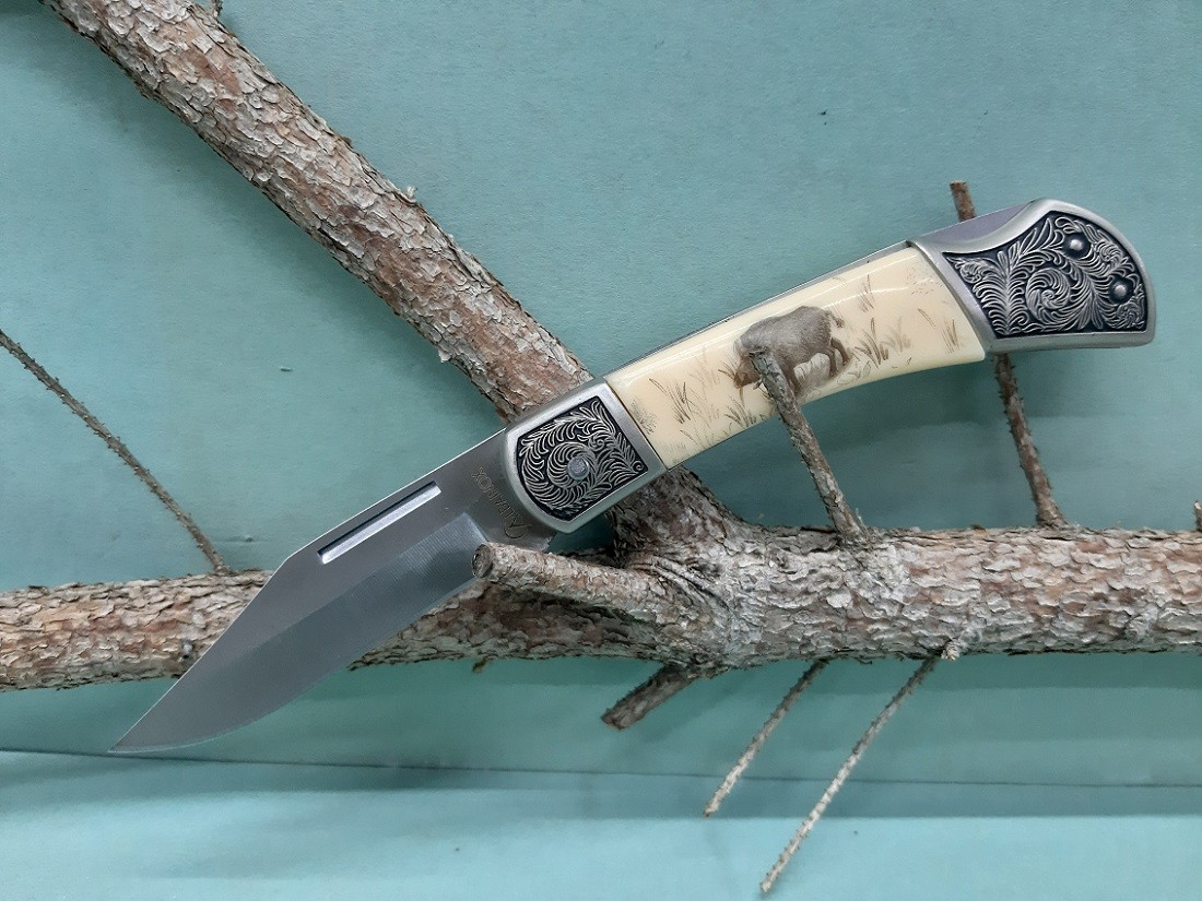 Nôž zdobí plastová biela rukoväť s imitáciou kosti a gravírovaného kovu s motívom diviaka, poskytujúc mu štýlový a prirodzený vzhľad.