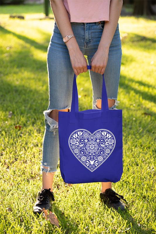 Úvod » Peňaženky a tašky » Tašky s potlačou » Bavlnená taška motív folklórne srdce biele Kráľovská modrá