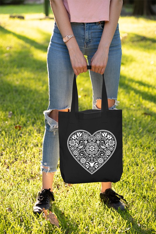 Plátená bavlnená nákupná taška s folklórnym motívom - srdce biele. Praktická a skladná, takže ju bez problémov môžete nosiť vždy so sebou. Vďaka dĺžke popruhov je vhodná na nosenie v ruke či cez rameno. Popruhy sú k zvýšeniu odolnosti krížovo prešité. Materiál: 100% bavlna; stredná gramáž 180 g/m2. Rozmery: taška 45 x 40 cm. Popruhy 60x2,5cm