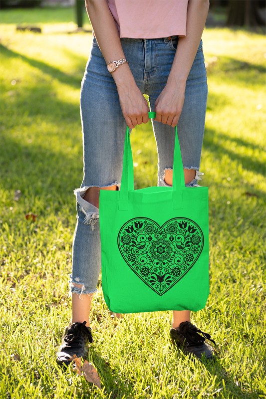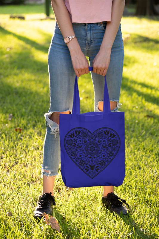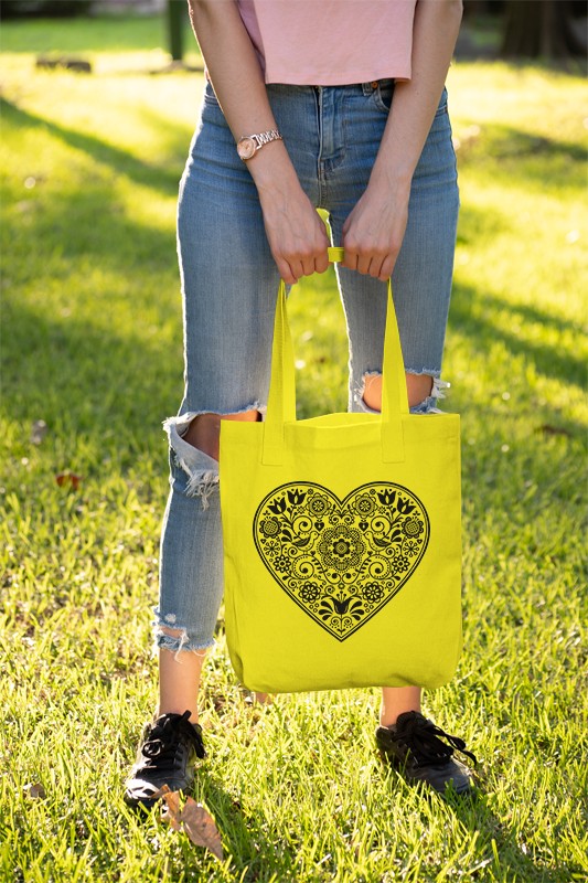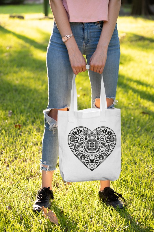 Plátená bavlnená nákupná taška s folklórnym motívom - srdce čierne. Praktická a skladná, takže ju bez problémov môžete nosiť vždy so sebou. Vďaka dĺžke popruhov je vhodná na nosenie v ruke či cez rameno. Popruhy sú k zvýšeniu odolnosti krížovo prešité. Materiál: 100% bavlna; stredná gramáž 180 g/m2. Rozmery: taška 45 x 40 cm. Popruhy 60x2,5cm