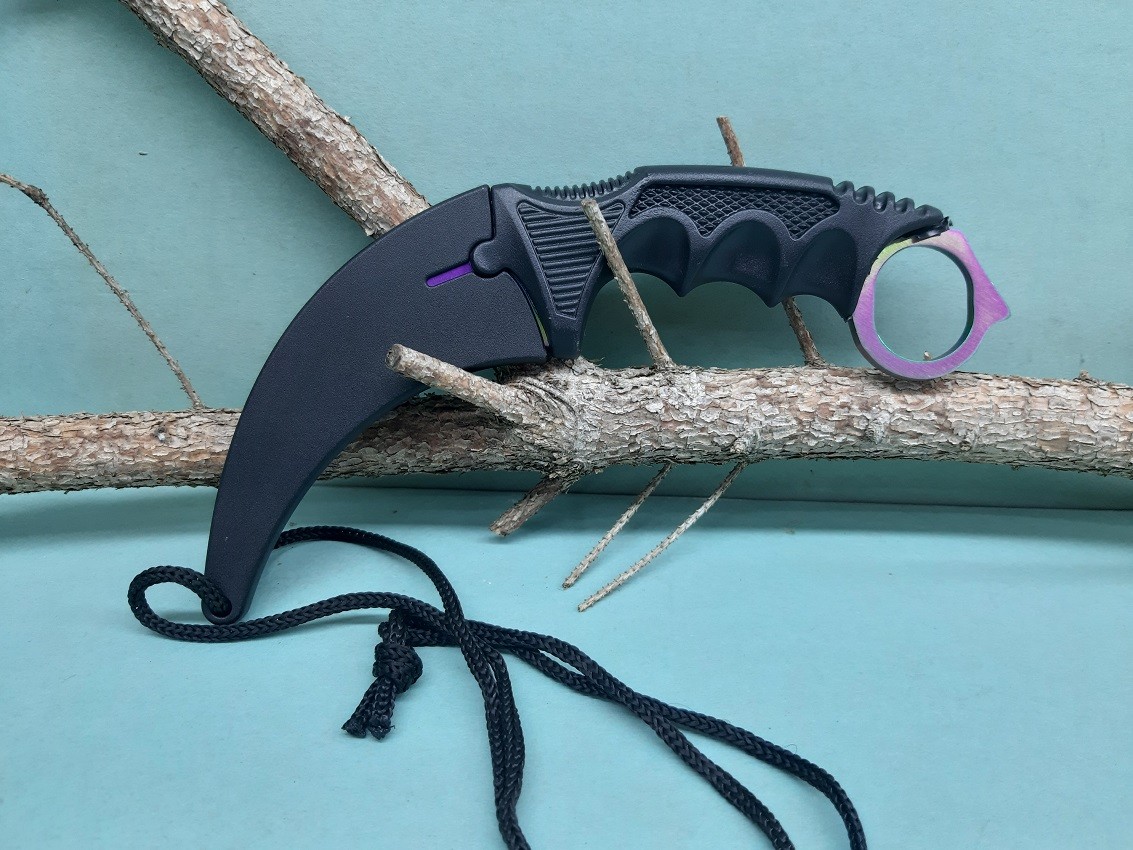 Bojový obranný nôž karambit CS s dúhovou, zahnutou čepeľou,zakončenú kovovým očkom.Anatomický tvarovaná rukoväť z tvrdeného plastu.Plastové puzdro je opatrené paracord lankom na zavesenie Dĺžka noža 19/9cm.