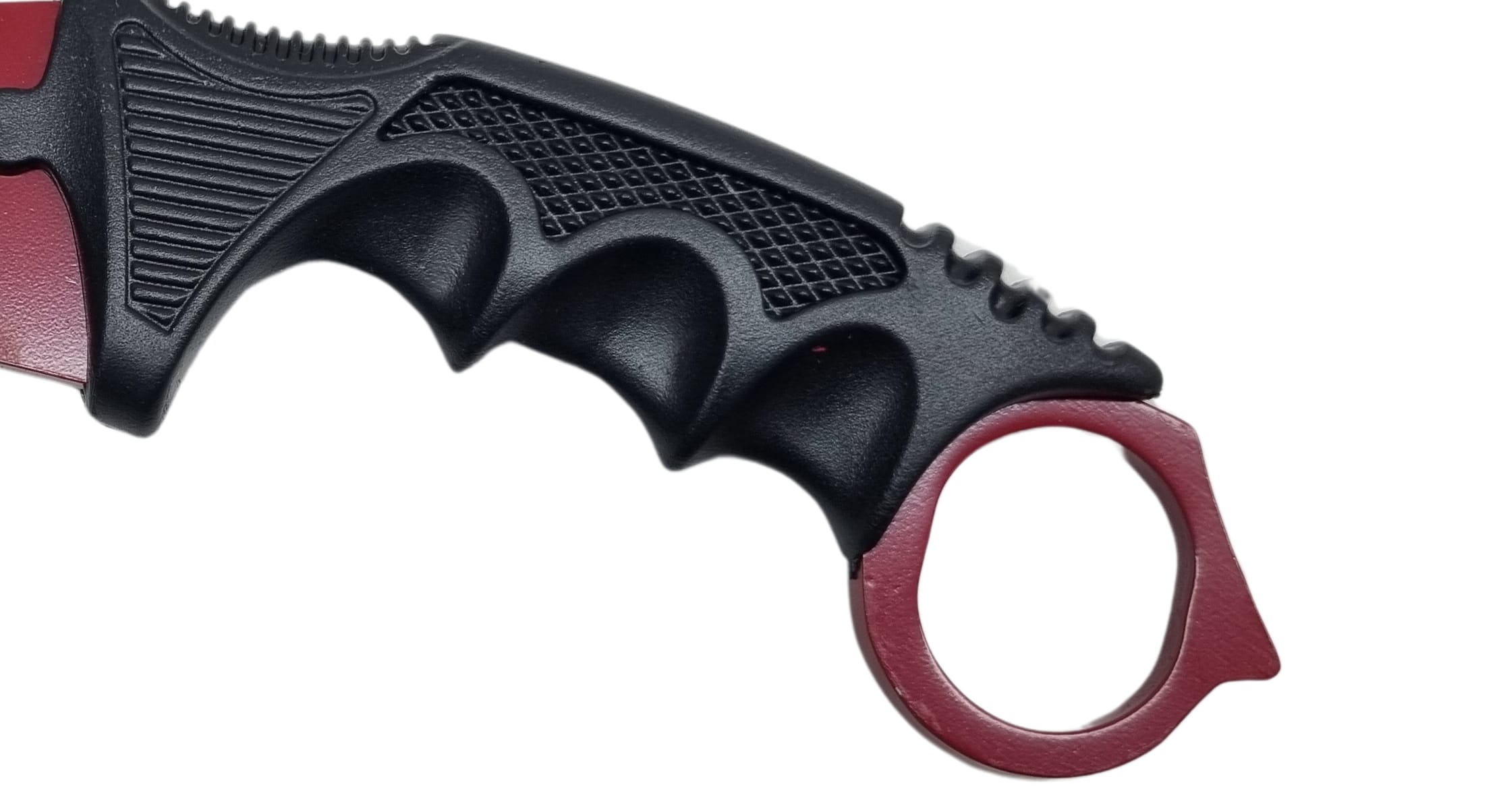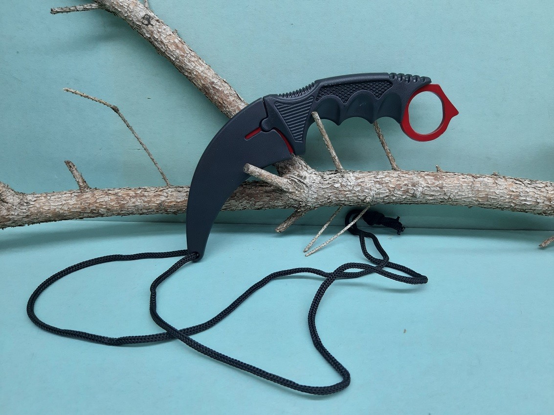 Bojový obranný nôž karambit s červenou, zahnutou čepeľou. Má plastovú tvarovanú rukoväť zakončenú kovovým očkom a čierne plastové puzdro s prevlečeným lankom. Dĺžka noža 19/9cm.