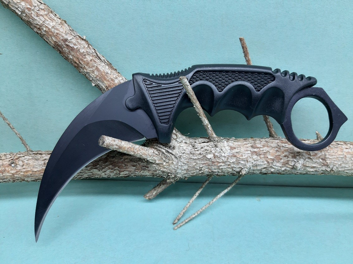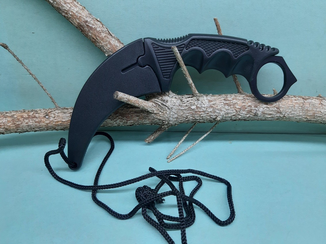 Bojový obranný nôž karambit s čiernou, zahnutou čepeľou. Má plastovú tvarovanú rukoväť zakončenú kovovým očkom a čierne plastové puzdro s prevlečeným lankom. Dĺžka noža 19/9cm.
