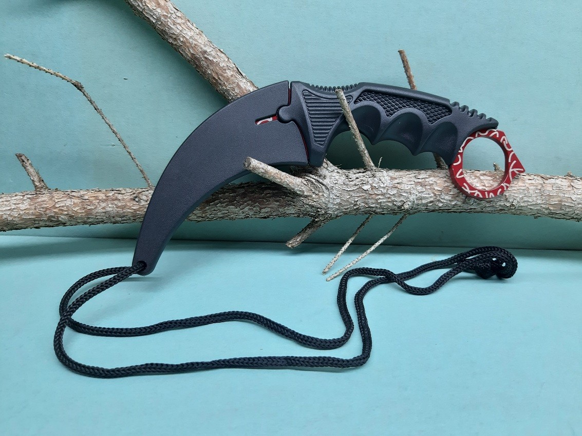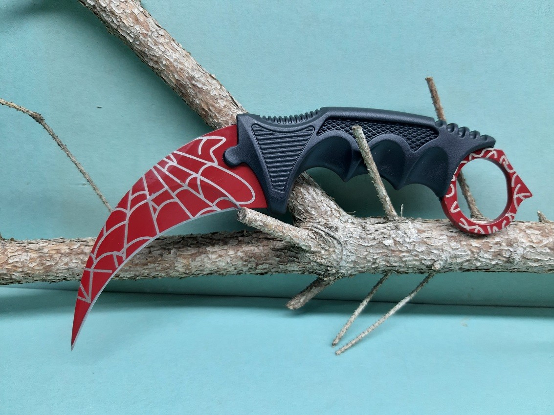 Bojový obranný nôž karambit s červenou nerezovou čepeľou motív pavučina. Má pevnú zahnutú čepeľ, plastovú tvarovanú rukoväť zakončenú kovovým očkom a čierne plastové puzdro s prevlečeným lankom. Dĺžka noža 19/9cm