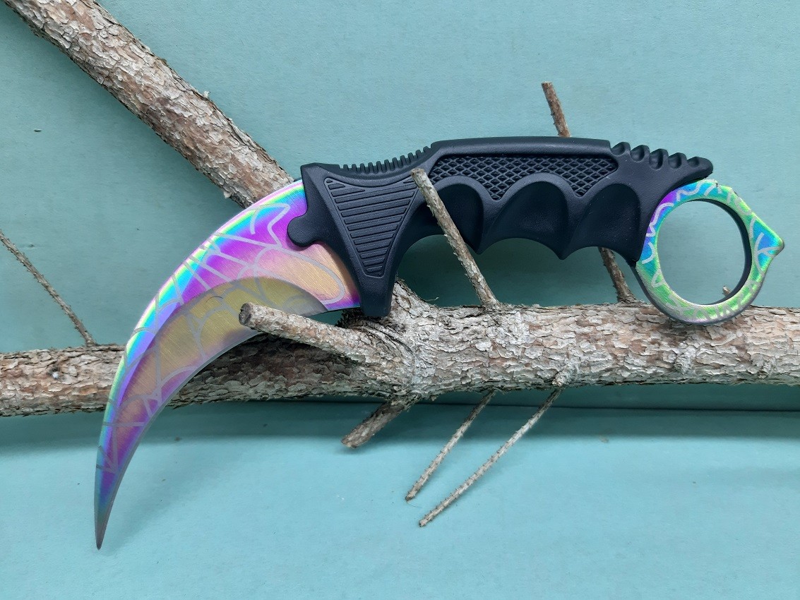 Bojový obranný nôž karambit s dúhovou nerezovou čepeľou motív pavučina. Má pevnú zahnutú čepeľ, plastovú tvarovanú rukoväť zakončenú kovovým očkom a čierne plastové puzdro s prevlečeným lankom. Dĺžka noža 19/9cm