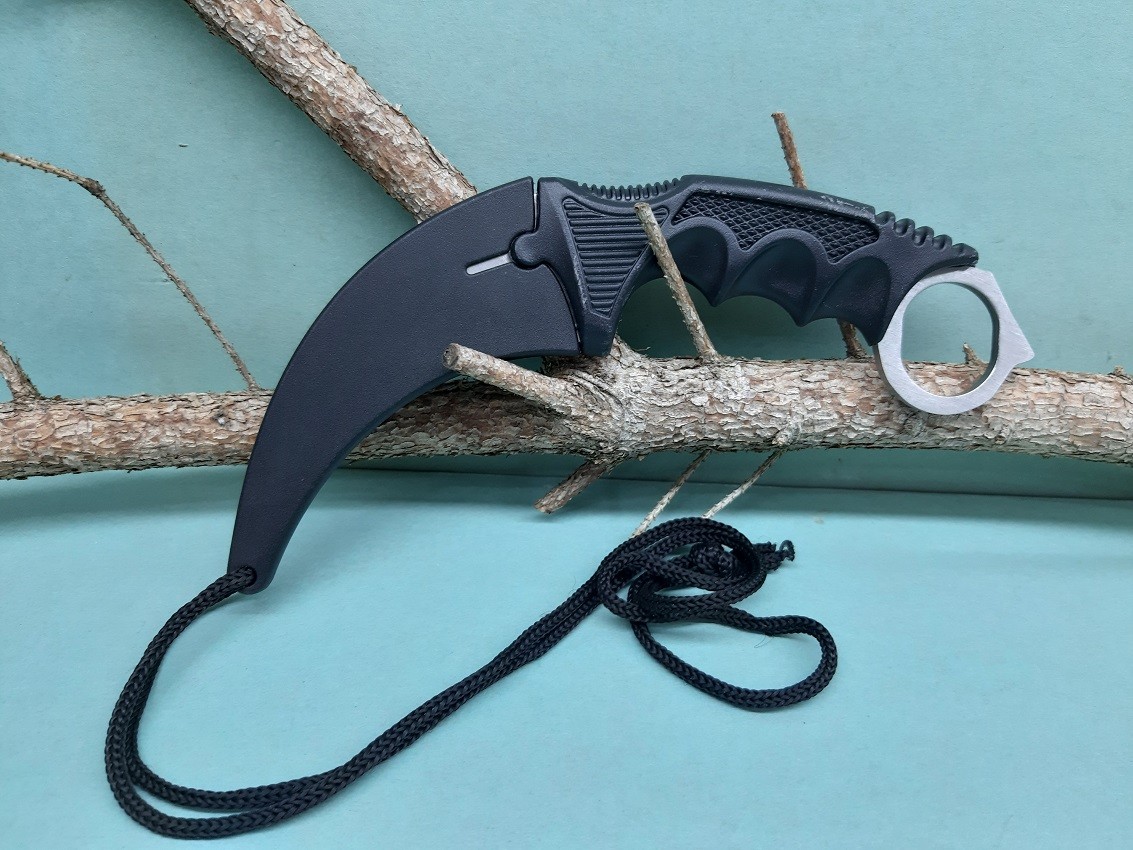 Bojový obranný nôž karambit so striebornou, zahnutou čepeľou. Má plastovú tvarovanú rukoväť zakončenú kovovým očkom a čierne plastové puzdro s prevlečeným lankom. Dĺžka noža 19/9cm.