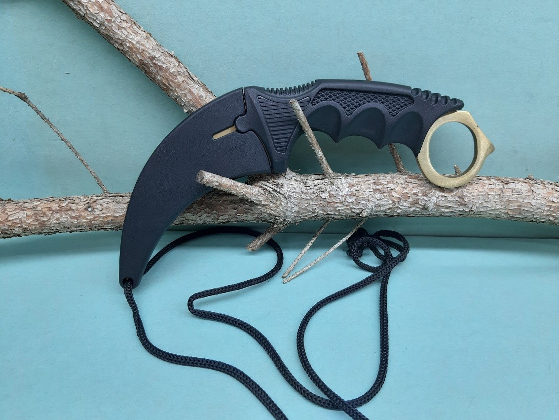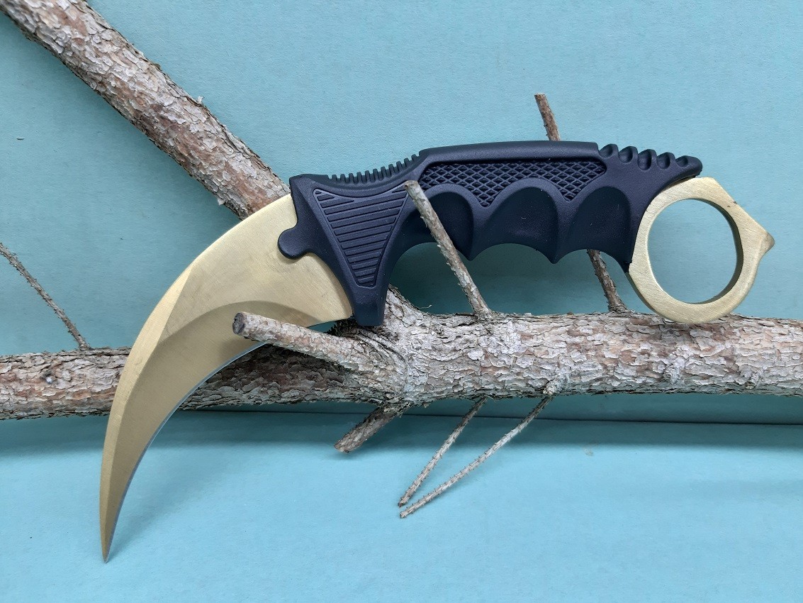Bojový obranný nôž karambit so zlatou zahnutou čepeľou. Má plastovú tvarovanú rukoväť zakončenú kovovým očkom a čierne plastové puzdro s prevlečeným lankom. Dĺžka noža 19/9cm.