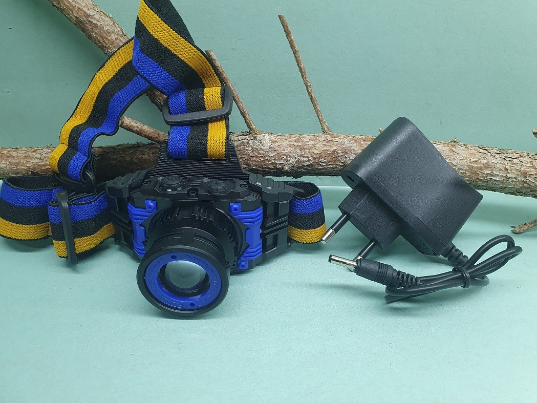 Čelová baterka s bielym svetlom s 3 módmi svietenia: silné, stredné a stroboskop. Zabudovaná batéria s výdržou 6 hodín sa nabíja nabíjačkou z elektrickej siete na 220V. Pri zasunutí nabíjačky sa rozsvieti LED dióda (červené svetlo ukazuje dobu nabíjania, zelené svetlo signalizuje ukončenie nabíjania). Svietivosť- 100m. Možný až 90° odklon čelovky od držiaku.