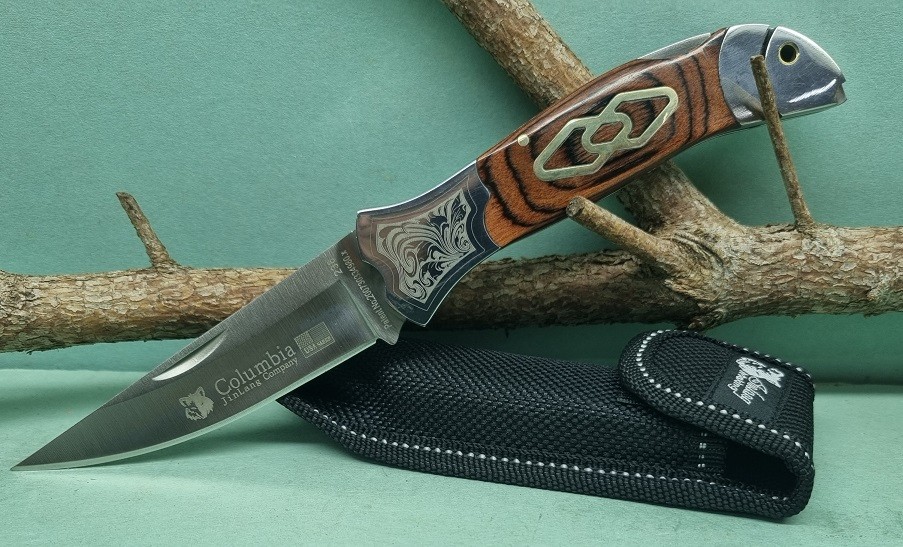 Zatvárací vreckový nôž Columbia USA saber s 8cm nerezovou čepeľou, kombinovanou rukoväťou drevo/gravírovaný kov, poistkou na spodnej časti noža a očkom na prevlečenie lanka. Dodáva sa spolu s čiernym nylónovým púzdrom. Celková dĺžka noža je 20cm.