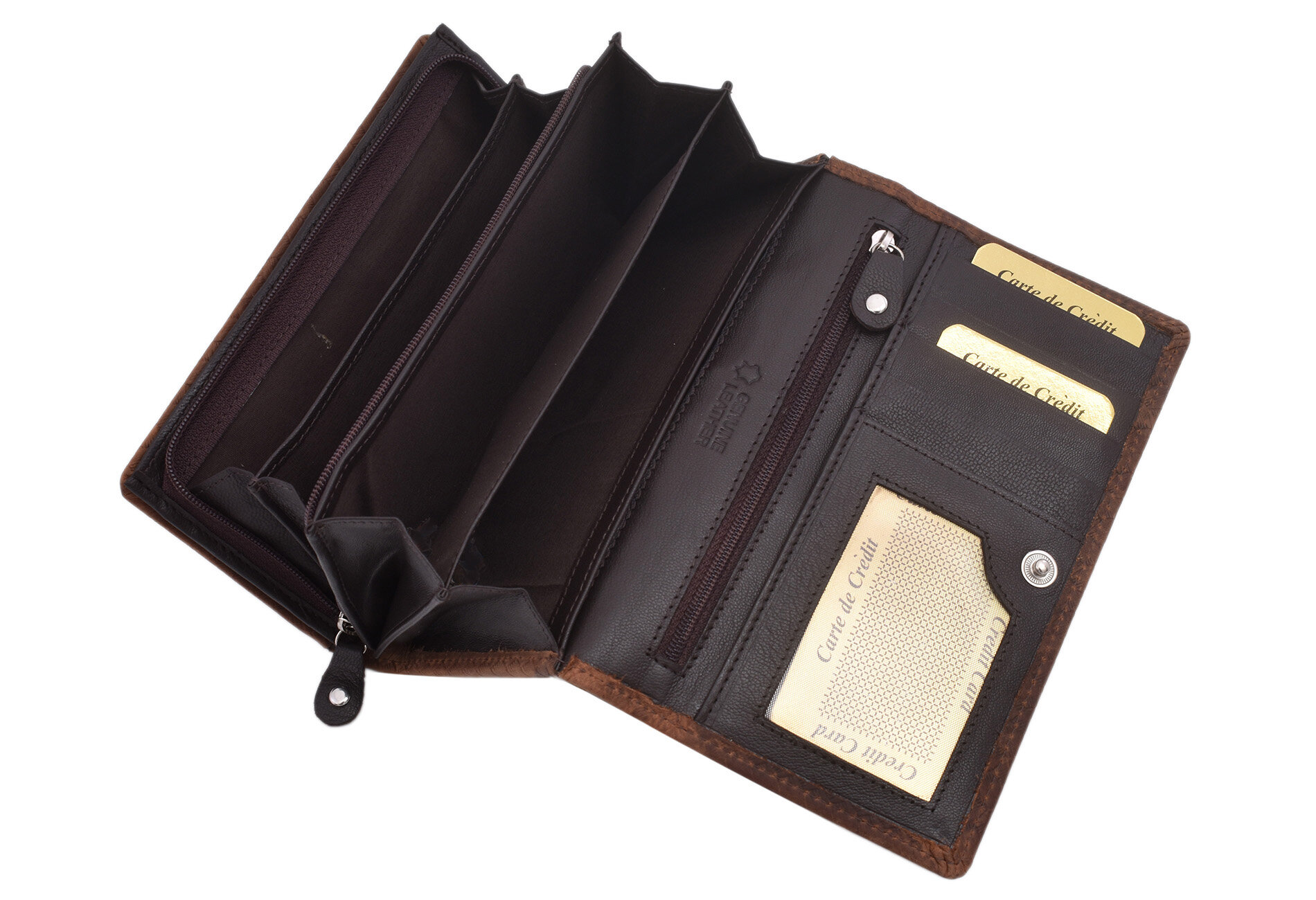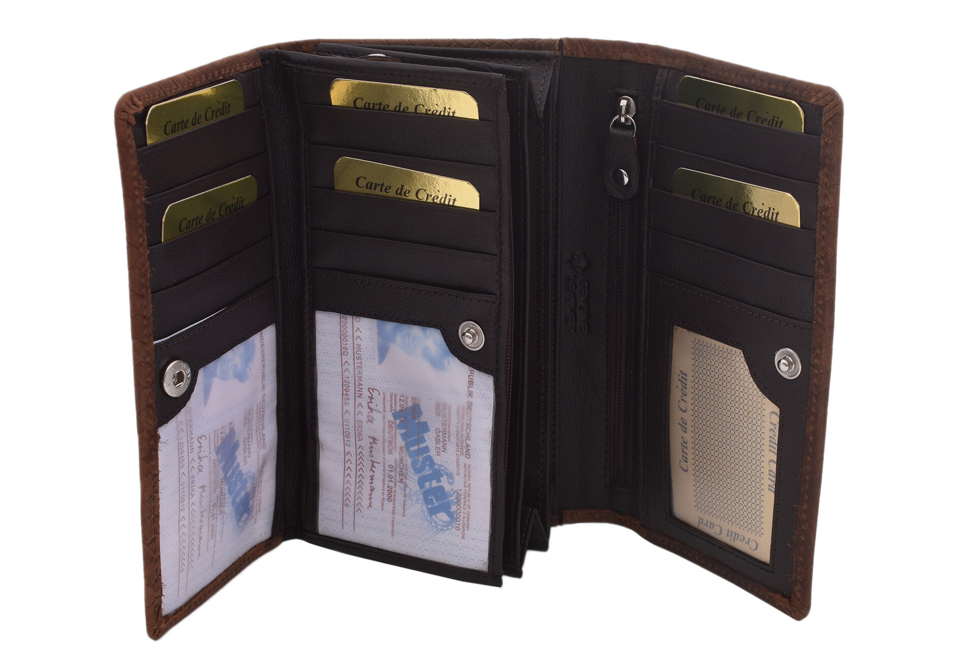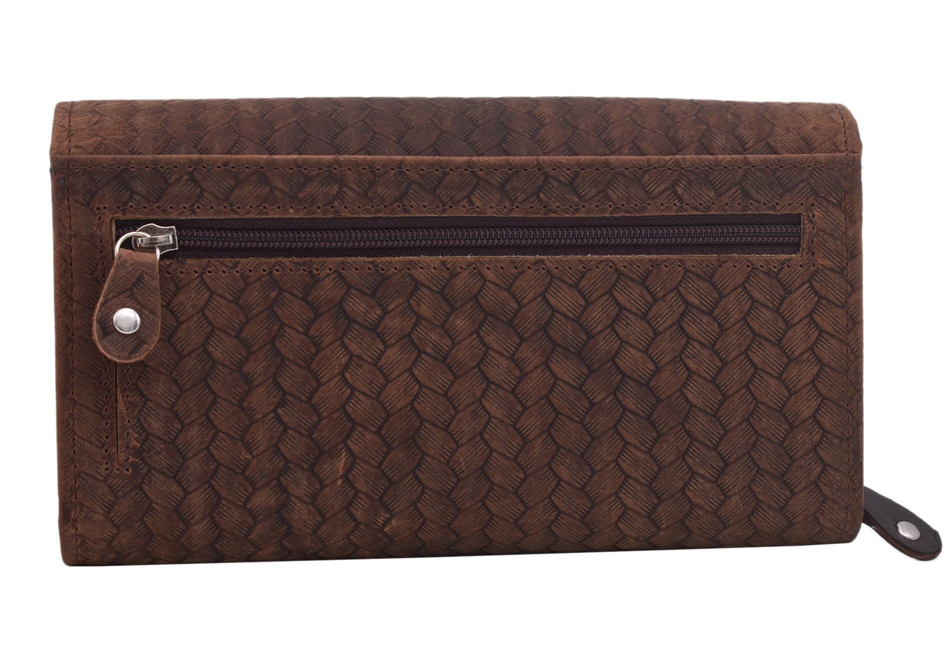 Elegantná kožená peňaženka v tmavej hnedej koži s pleteným vzorom.