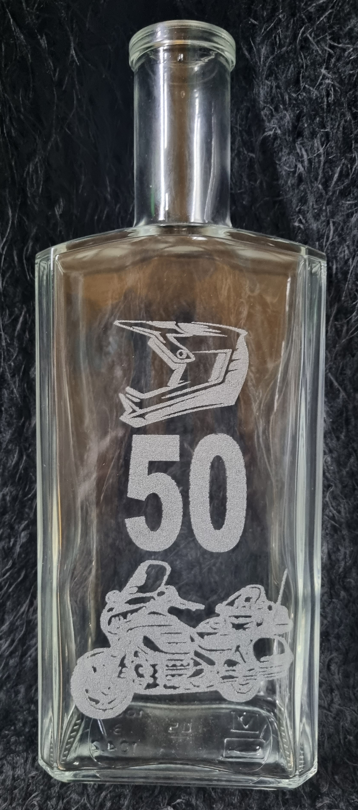 Sklenená fľaša s objemom 1 liter, zdobená vygravírovaným motívom VŠETKO NAJLEPŠIE 50", predstavuje štýlový a osobitný doplnok. Fľaša je vyrobená z vysoko odolného skla, ktoré je vhodné pre skladovanie nápojov. Tento materiál je bezpečný na použitie a chráni obsah fľaše pred vonkajšími vplyvmi.