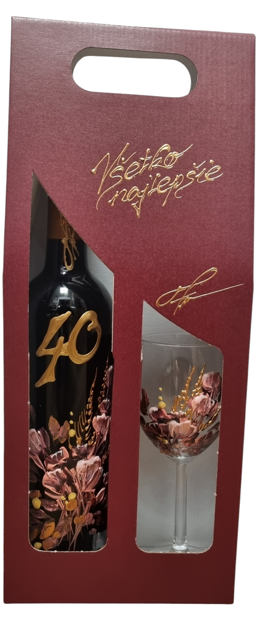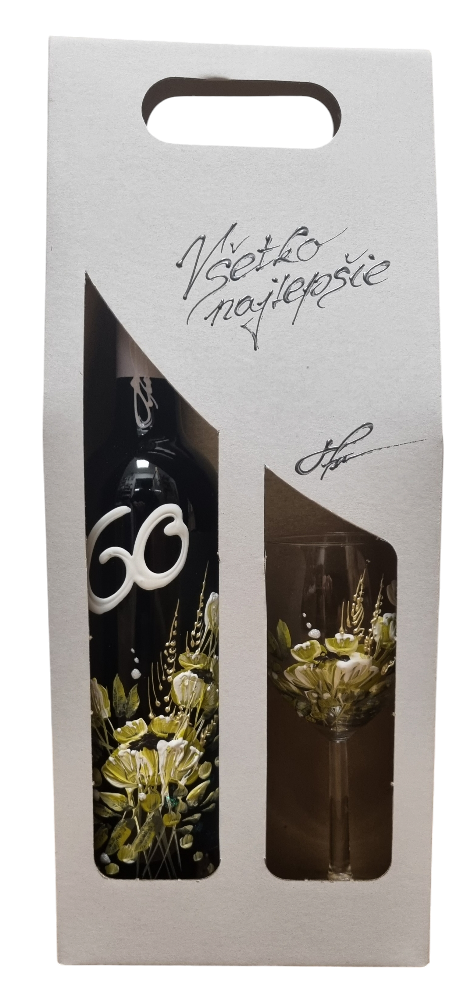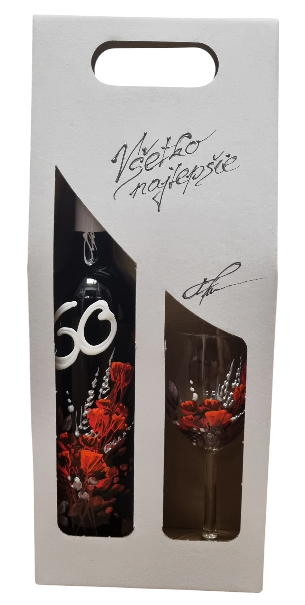 Darčeková kazeta s ručne maľovanou fľaškou 0,75l červeného, alebo bieleho suchého vína, a jedným pohármom s obsahom 300ml.