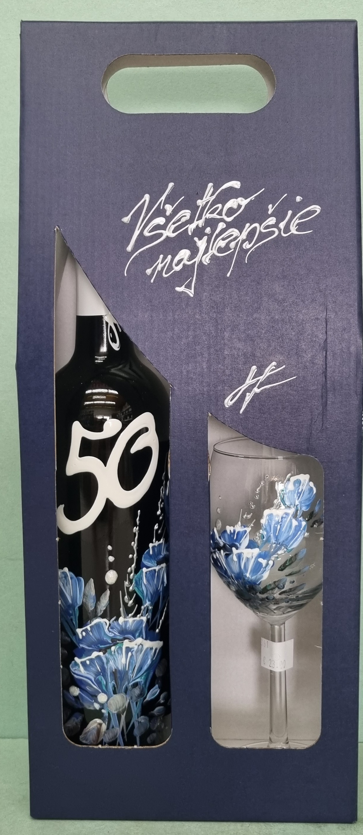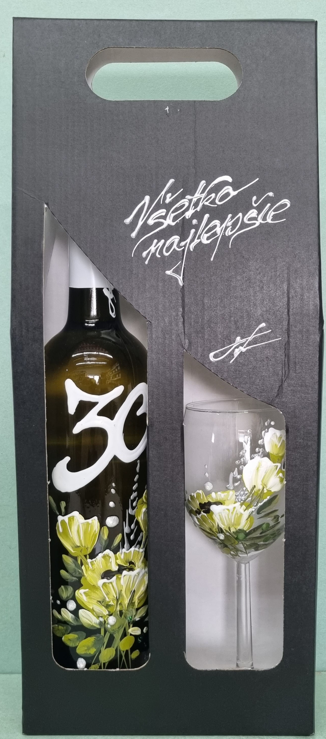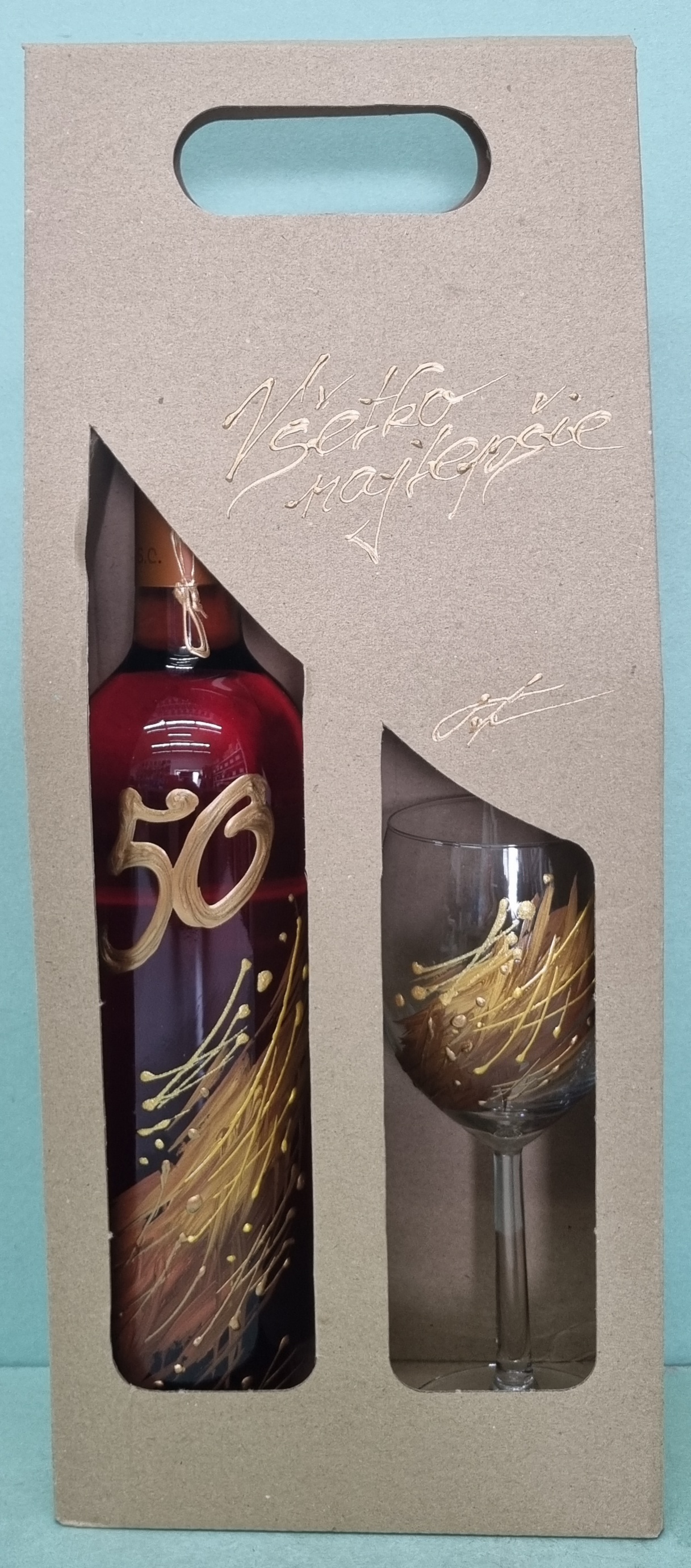 Darčeková kazeta s ručne maľovanou fľaškou 0,75l červeného, alebo bieleho suchého vína, a jedným pohármom s obsahom 300ml.