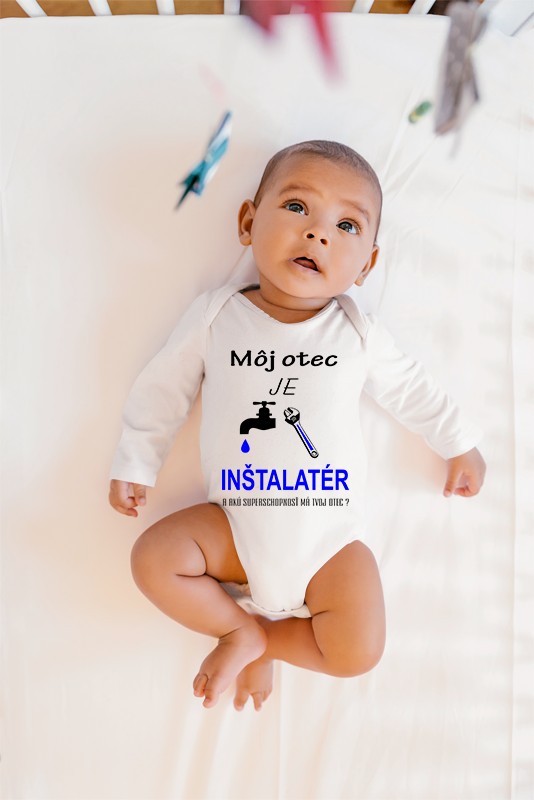 Detské bodíčko s dlhým rukávom s nápisom : Môj otec je inštalatér a akú schopnosť má tvoj otec?Originálne bavlnené dojčenské body s krátkym rukávom s potlačou, použité farby k potlači sú certifikované a zdravotne nezávadné. Je vyrobené z príjemného a kvalitného materiálu bavlna, v ktorom sa Vaše bábätko bude cítiť príjemne. Praktické zapínanie na cvočky na ramienku a medzi nožičkami uľahčí obliekanie a prebaľovanie. Body je pre bábätká dôležitým kúskom oblečenia, pri akomkoľvek pohybe je chrbátik bábätka stále chránený. Ošetrovanie : prať na 30°C obrátené naruby, nežehliť cez potlač, nevhodné do sušičky.