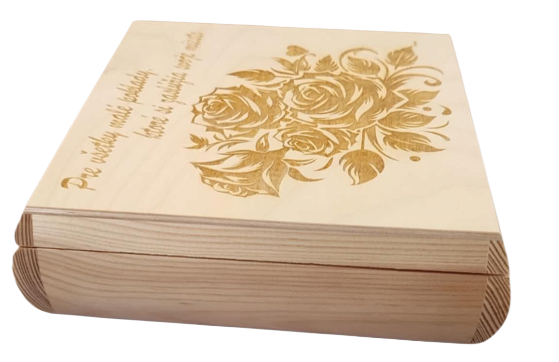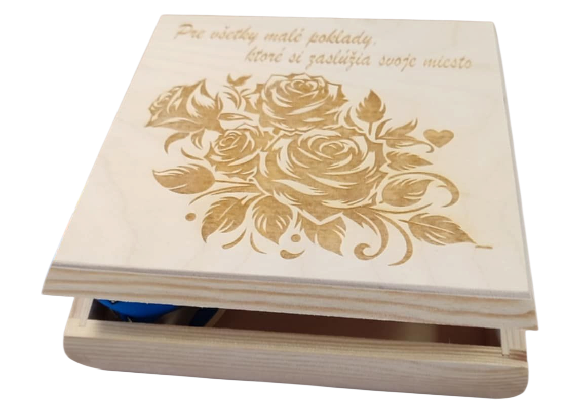 Na veko drevenej krabičky vieme vygravírovať vlastný nápis, venovanie, dátum, meno alebo dokonca jednoduchý obrázok či symbol. Či už ide o krátky citát, meno dieťaťa, iniciály novomanželov, srdce, krížik, labku, motýľa alebo ručne kreslený motív – radi premeníme vašu predstavu na originálny gravírovaný detail, ktorý urobí z krabičky skutočne jedinečný kúsok.