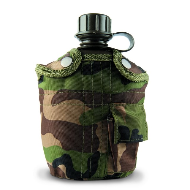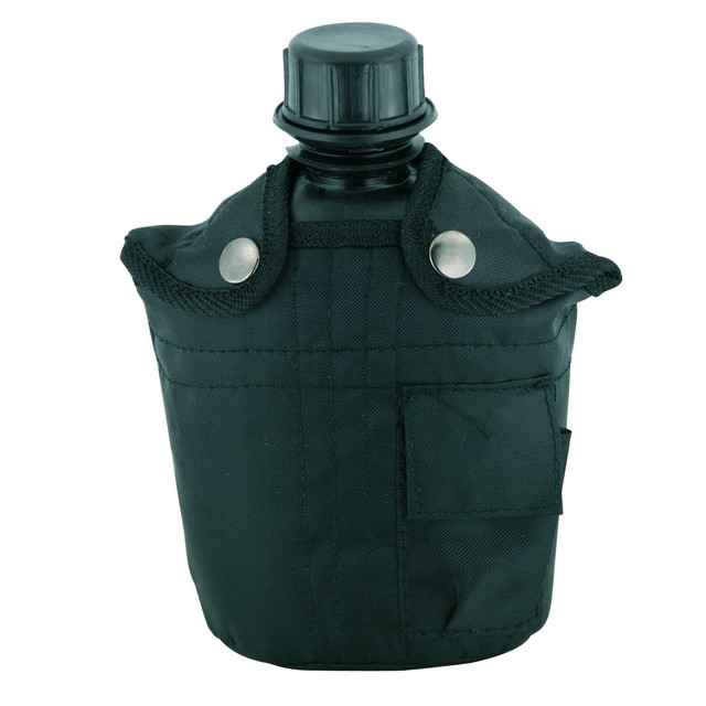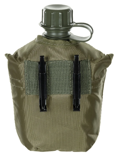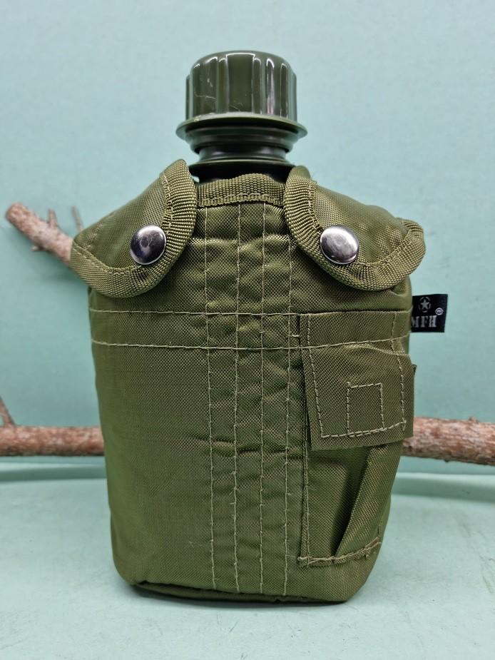 Fľaša plastová uzáver je pripevnený k hrdlu fľaše. Objem fľaše je 1liter. Textilný obal s vreckom je v zelenom, čiernom alebo maskáčovom prevedení - treba uviesť do objednávky. Taktiež má dva klipy pre upevnenie na opasok. Použitie: na krátkodobý prenos nealkoholických tekutín.