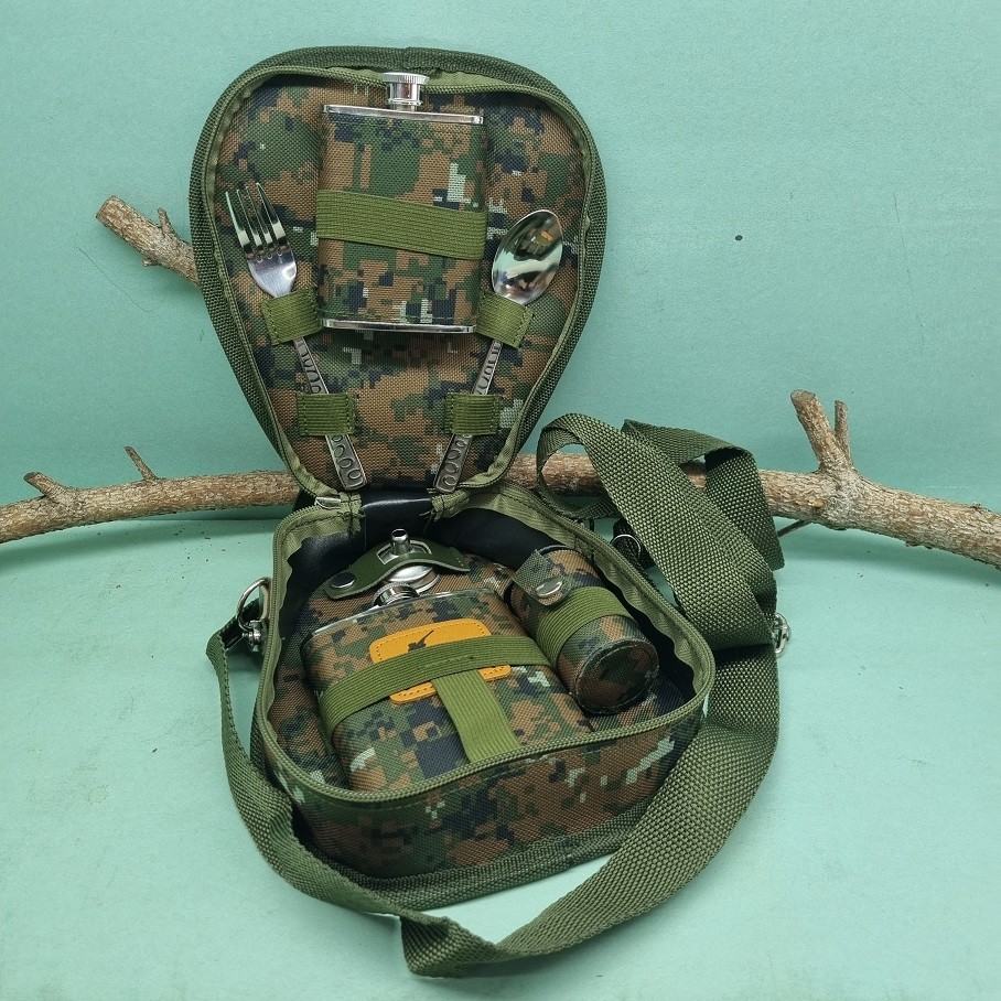 Malá maskáčová taška s nastaviteľným popruhom na plece obsahuje ploskačku - 240ml, ploskačku - 200ml, lievik, vidličku, lyžičku a sadu štyroch nerezových pohárikov v samostatnom púzdre. Taška je štýlovým doplnkom pre každodenné využitie alebo outdoorové dobrodružstvá.