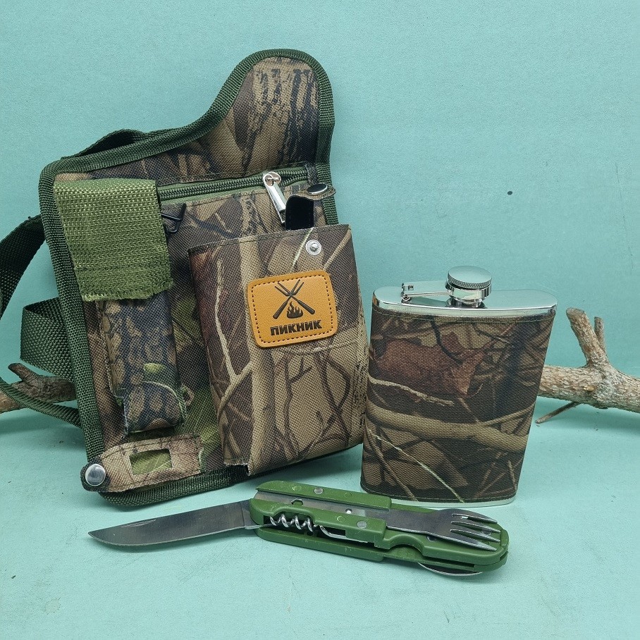 Praktická taška s nastaviteľným popruhom na plece do prírody pre poľovníkov , rybárov a turistov, obsahuje ploskačku - 270ml a praktický príbor v samostatnom púzdre. V ľadvinke je priehradka so zipsom na uloženie napríklad dokladov. Ploskačka je potiahnutá textilom v listovom vzore . Pekný darček pre milovníkov prírody.