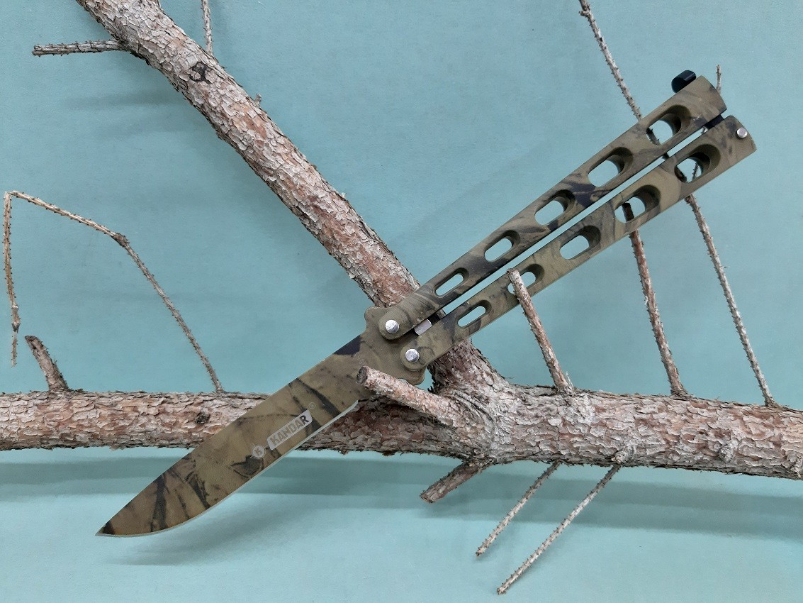 Nôž skladací, motýľ s nerezovou čepeľou, plnofarebný-list. Na rukoväti je kolík pre zaistenie v otvorenom aj zatvorenom stave. Kvalitné prevedenie nitované, bez skrutiek. Dĺžka noža 23/10,5cm.