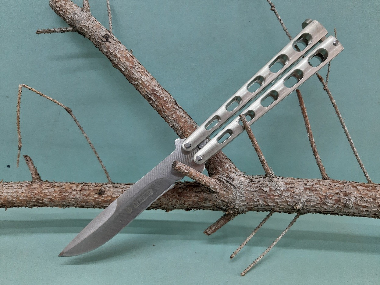 Nôž skladací, motýľ s nerezovou čepeľou, plnofarebný-strieborný. Na rukoväti je kolík pre zaistenie v otvorenom aj zatvorenom stave. Kvalitné prevedenie nitované, bez skrutiek. Dĺžka noža 23/10,5cm.