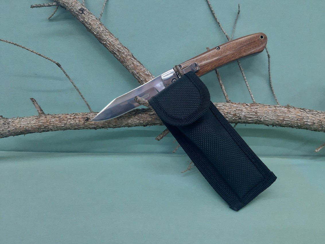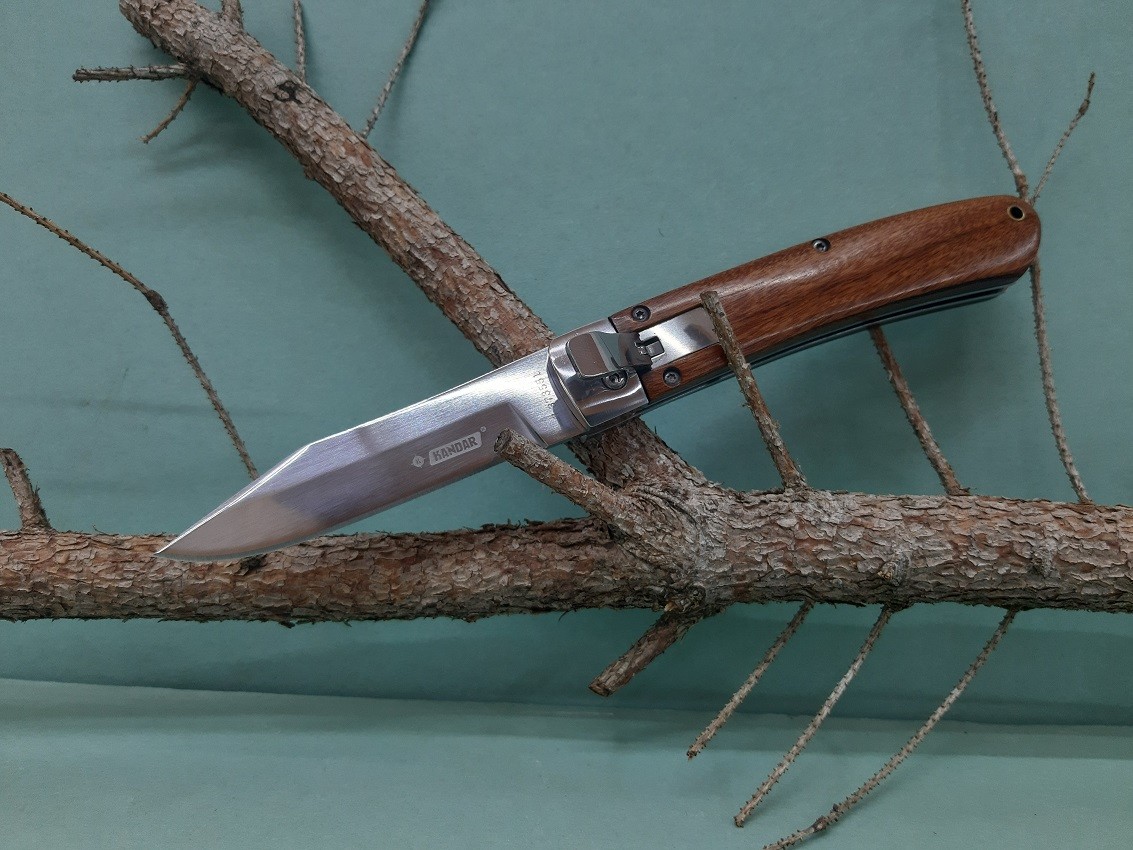 Vyskakovací nôž Kandar s nerezovou čepeľou, drevenou rukoväťou a očkom na prevlečenie šnúrky. Dodáva sa spolu s čiernym nylonovým puzdrom. Dĺžka noža je 21/9cm.