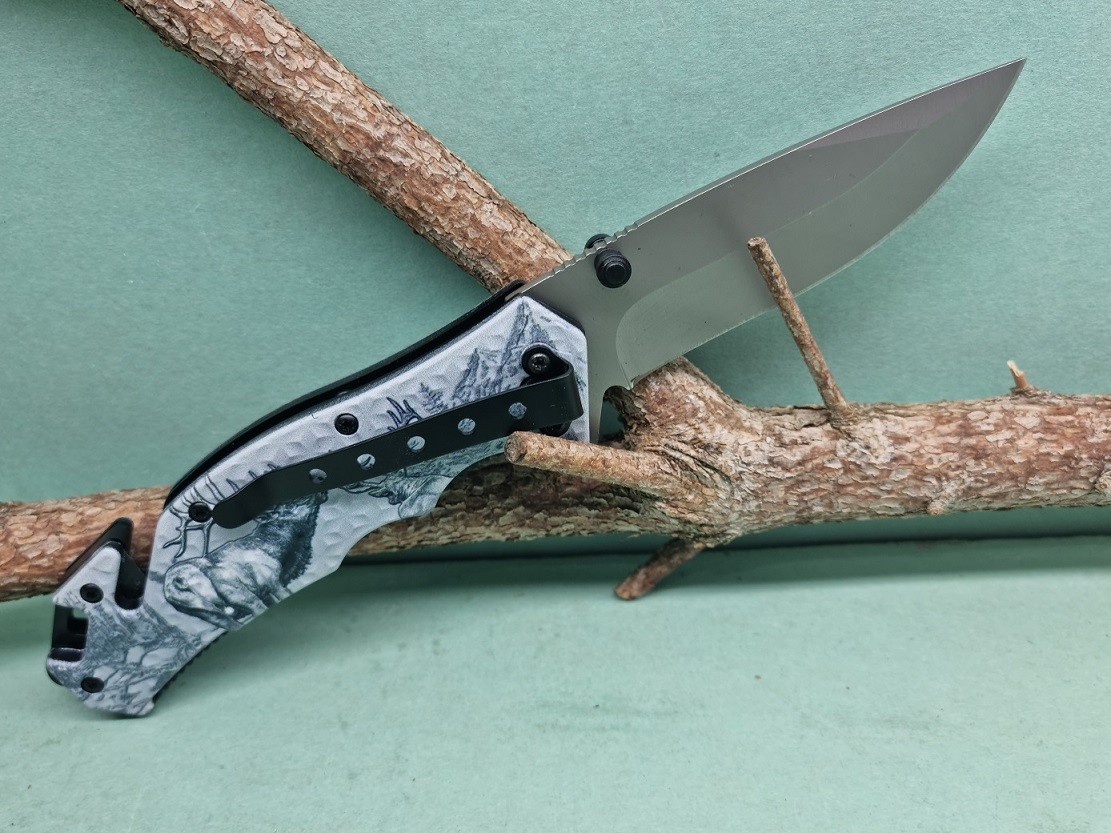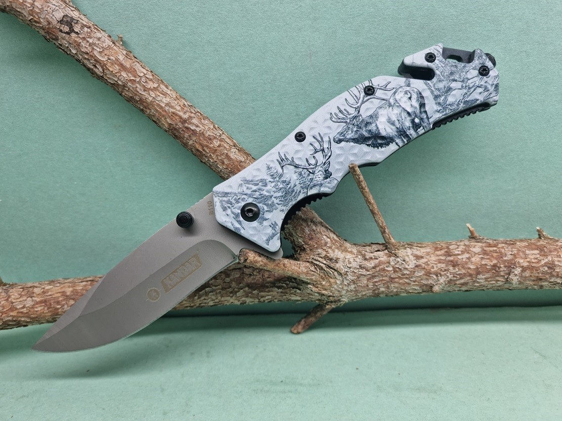 Zatvárací nôž Kandar kombinuje spoľahlivý výkon s praktickými funkciami pre rôznorodé situácie. S nerezovou čepeľou a modrou plastovou rukoväťou zdobenou motívom jeleňa predstavuje spoľahlivého spoločníka.