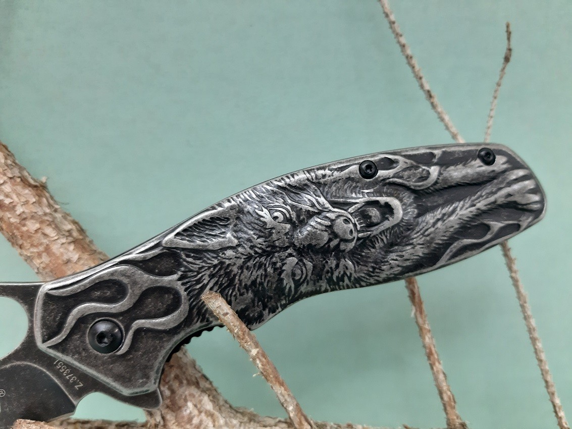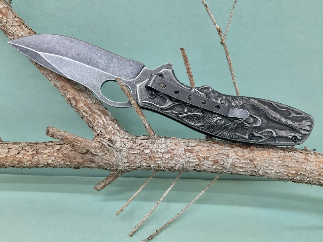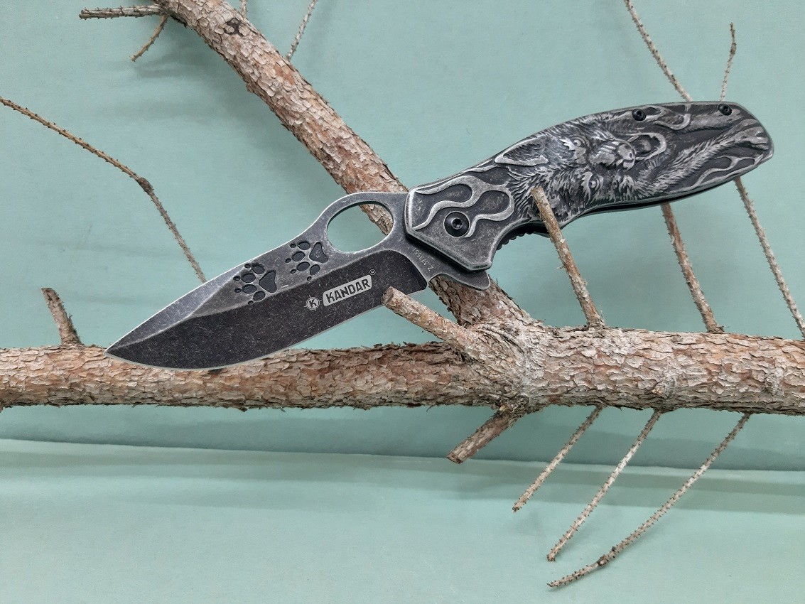Zatvárací vreckový nôž Kandar s 9cm nerezovou čepeľou s očkom pre jednoduché zatváranie/otváranie noža a kovovou gravírovanou rukoväťou s motívom vlk. Nôž má klip na zavesenie na opasok, vďaka ktorému bude po ruke vždy keď ho budete potrebovať, poistku proti samovoľnému zatvoreniu noža a asistenciu na otváranie jednou rukou. Celková dĺžka noža je 21cm.