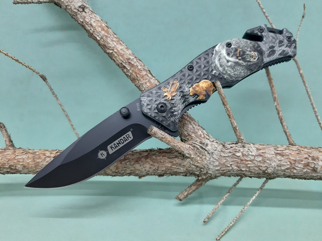 Vreckový zatvárací nôž Kandar s čiernou 8,5cm nerezovou čepeľou. Plastovou rukoväťou s motívom medveď s rezačom na lano hrotom na rozbíjanie skla, poistkou a s asistenciou na otváranie jednou rukou. Na zadnej časti má klip na uchytenie na opasok. Celková dĺžka noža je 21cm.