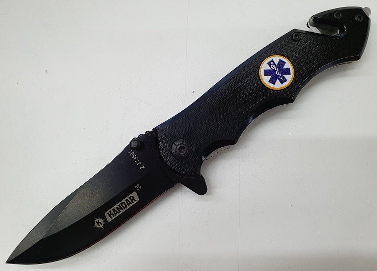 Vreckový zatvárací nôž Kandar s čiernou 8,5cm nerezovou čepeľou. Čiernou rukoväťou so záchranárskym znakom, rezačom na lano, hrotom na rozbíjanie skla, poistkou a asistenciou na otváranie jednou rukou. Celková dĺžka noža je 21,5cm. Na zadnej časti má klip na uchytenie na opasok. Dodávané v darčekovom balení.
