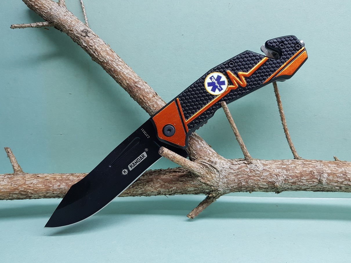 Vreckový zatvárací nôž Kandar s čiernou 9,5cm nerezovou čepeľou, plastovou rukoväťou so záchranárskym znakom. Rezačom na lano, hrotom na rozbíjanie skla, poistkou a asistenciou na otváranie jednou rukou. Celková dĺžka 22cm. Na zadnej časti má klip na uchytenie na opasok. Dodávané v darčekovom balení.