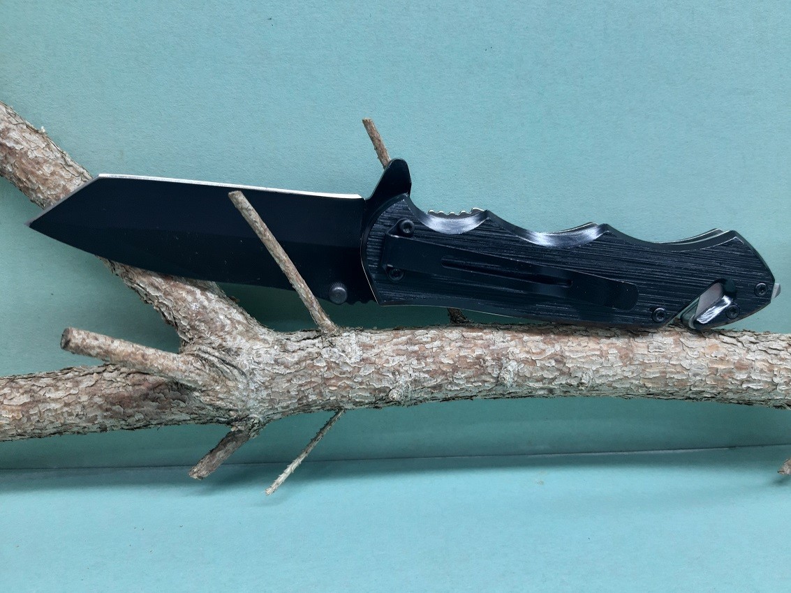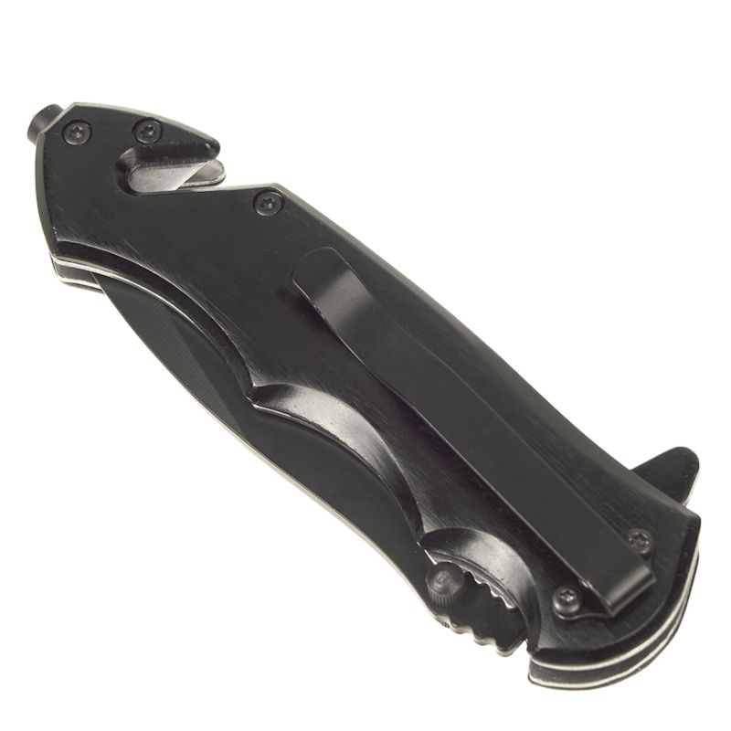 Vreckový zatvárací nôž Kandar s čiernou 8,5cm nerezovou čepeľou. Čiernou kovovou rukoväťou s hasičským znakom, rezačom na lano, hrotom na rozbíjanie skla, asistenciou na otváranie jednou rukou a poistkou proti samovoľnému zatvoreniu. Celková dĺžka noža je 21,5cm. Na zadnej časti má klip na zavesenie na opasok.