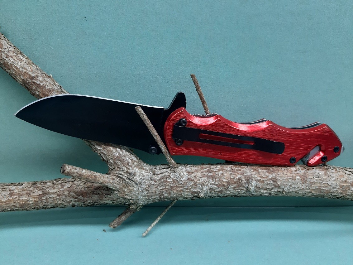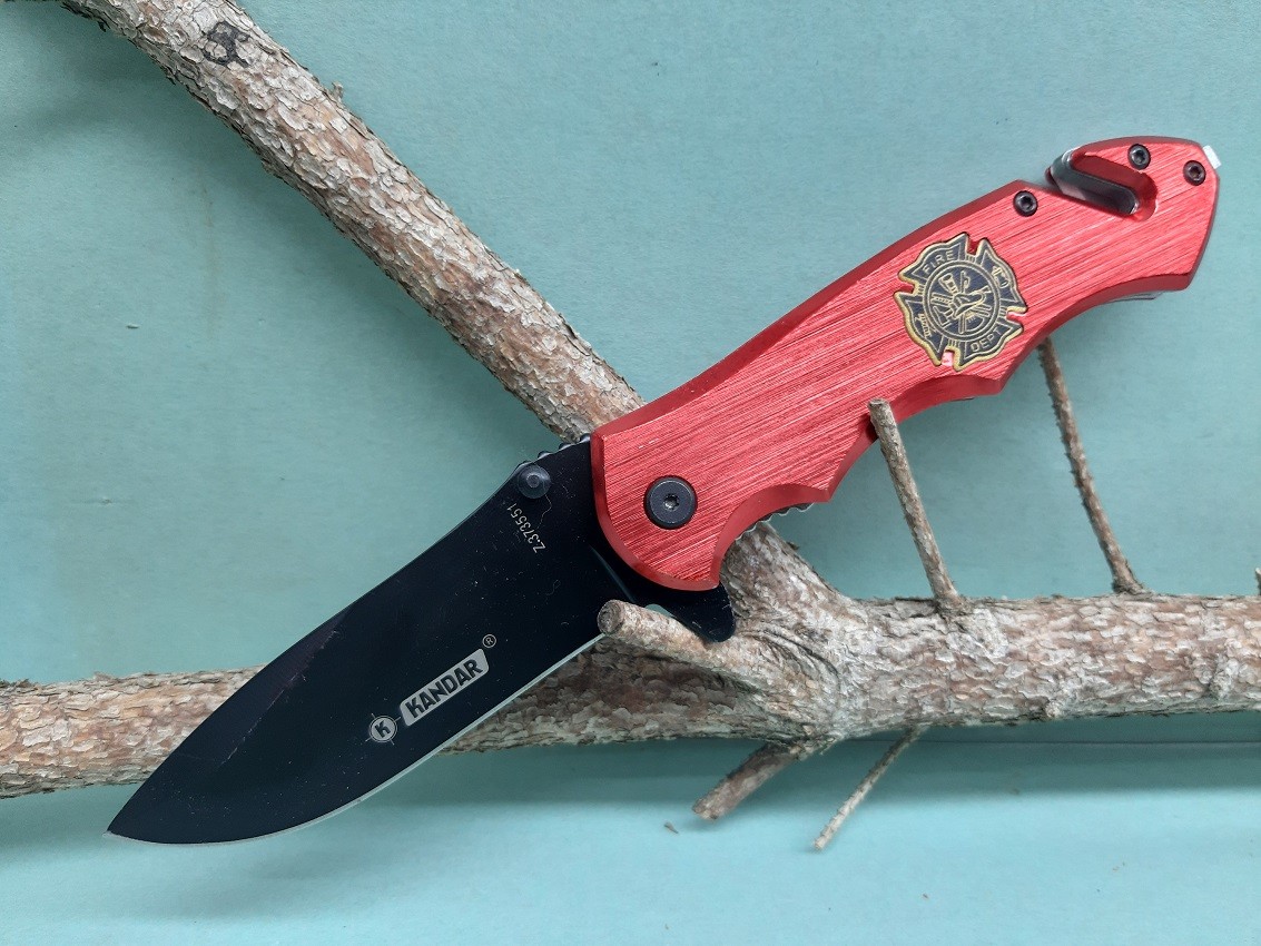 Vreckový zatvárací nôž Kandar s čiernou 8,5cm nerezovou čepeľou. Červenou kovovou rukoväťou s hasičským znakom, rezačom na lano, hrotom na rozbíjanie skla, asistenciou na otváranie jednou rukou a poistkou proti samovoľnému zatvoreniu. Celková dĺžka noža je 21,5cm. Na zadnej časti má klip na zavesenie na opasok.