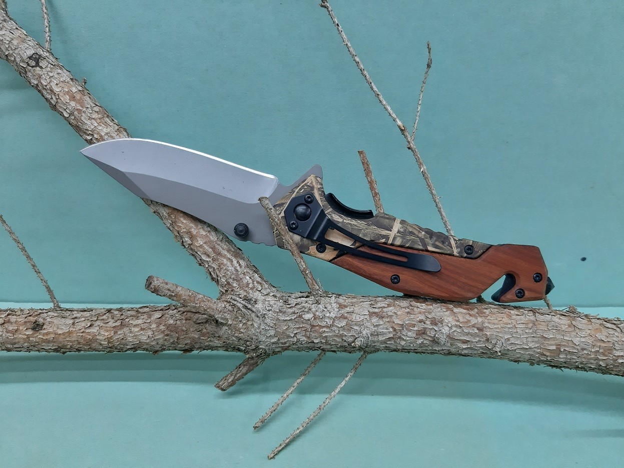 Zatvárací vreckový nôž Kandar s 8cm nerezovou čepeľou a drevenou rukoväťou. Nôž má poistku proti samovoľnému zatvoreniu noža, rezač na lano, hrotom na rozbíjanie skla a asistenciou na otváranie jednou rukou. Na zadnej strane sa nachádza klip na zavesenie na opasok. Dĺžka noža je 20cm.