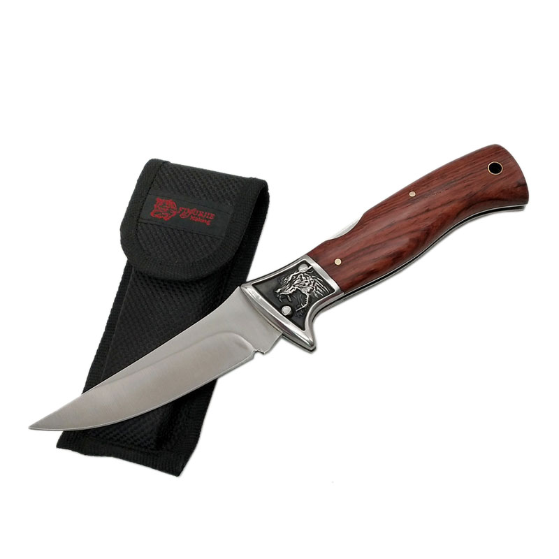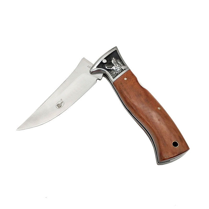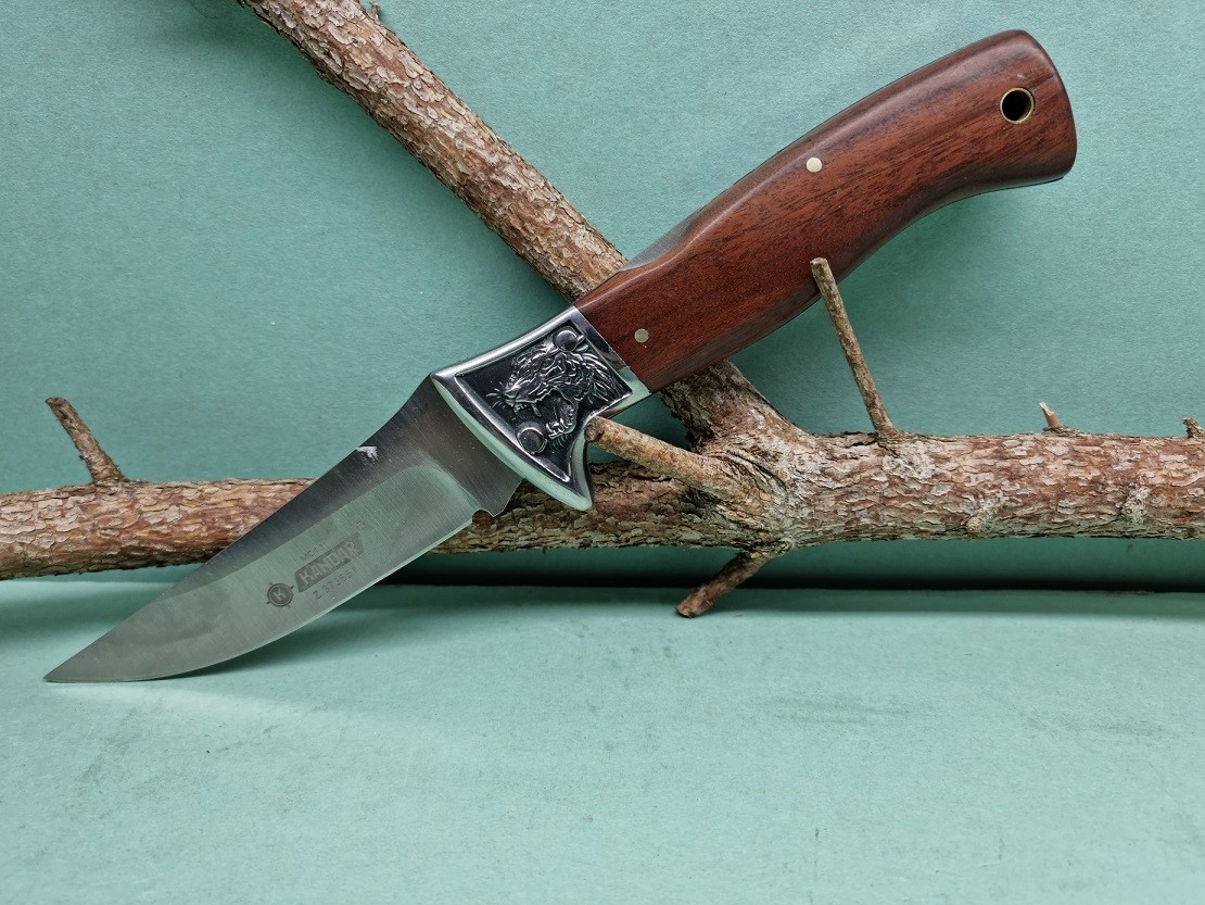 Zatvárací vreckový nôž Kandar s nerezovou 9,5cm nerezovou čepeľou a kombinovanou rukoväťou drevo/gravírovaný kov s motívom tiger. Nôž má očko na prevlečenie šnúrky alebo lanka a poistku proti samovoľnému zatvoreniu noža. Dodáva sa spolu s čiernym nylonovým puzdrom. Celková dĺžka noža je 23cm.