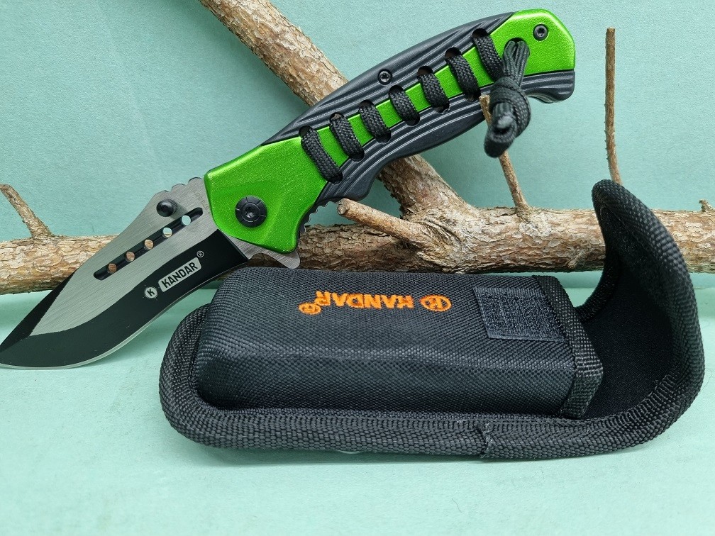 Zatvárací vreckový nôž Kandar s nerezovou 9cm čepeľou a plastovou zeleno-čiernou rukoväťou s prevlečeným paracord lankom. Nôž má klip na zavesenie na opasok ktorý zabezpečuje rýchly prístup k nástroju vždy, keď ho potrebujete a poistku proti samovoľnému zatvoreniu, čo znamená, že čepeľ sa náhodne nezatvorí počas používania. Dodáva sa spolu s čiernym nylónovým puzdrom. Celková dĺžka noža je 21,5cm.