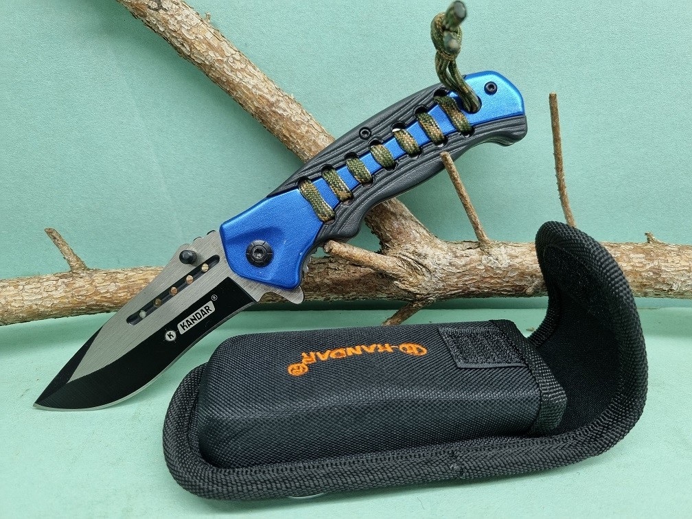 Zatvárací vreckový nôž Kandar s nerezovou 9cm čepeľou a plastovou modro-čiernou rukoväťou s prevlečeným paracord lankom. Nôž má klip na zavesenie na opasok ktorý zabezpečuje rýchly prístup k nástroju vždy, keď ho potrebujete a poistku proti samovoľnému zatvoreniu, čo znamená, že čepeľ sa náhodne nezatvorí počas používania. Dodáva sa spolu s čiernym nylónovým púzdrom. Celková dĺžka noža je 21,5cm.