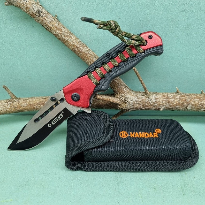 Zatvárací vreckový nôž Kandar s čiernou nerezovou 9cm čepeľou a plastovou červeno-čiernou rukoväťou s prevlečeným paracord lankom. Má nylonové puzdro, klip na zavesenie na opasok a poistku proti samovoľnému zatvoreniu noža. Celková dĺžka noža je 22cm.