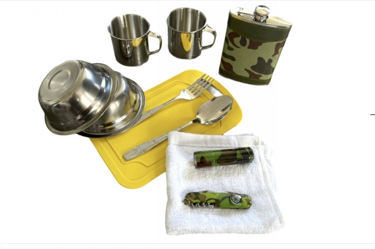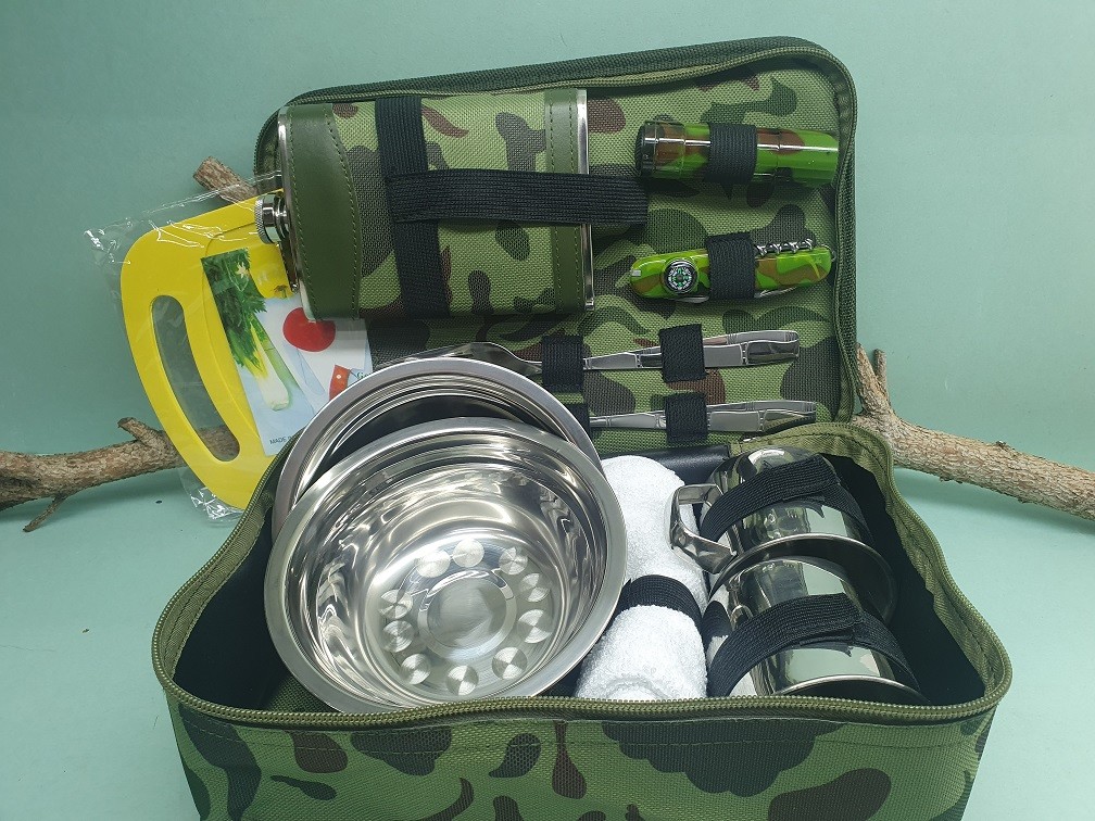 Kempingová súprava v textilnej maskáčovej taške na zips obsahuje 2 nerezové misky, 2 nerezové hrnčeky, utierku, plastovú dosku na krájanie, veľkú lyžicu a vidličku, multifunkčný skladací nožík s kompasom, baterku a ploskačku s objemom 270ml. Túto skvelú súpravu využijete pri všetkých outdoorových aktivitách.