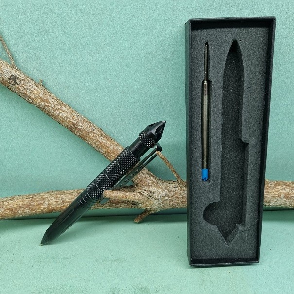 Čierne viacúčelové kovové pero s čiernou náplňou, náhradná náplň je modrá. Telo pera je kovové, pevné . Dĺžka je 15 cm . Na konci pera je kovový hrot. Pero je v darčekovom balení.