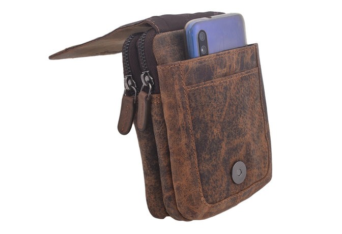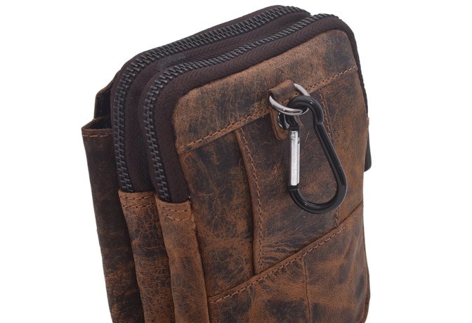 Závesná taška na opasok s predným preklopom. Taška má dve hlavné zipsové komory a dve otvorené priehradky na mobil a karty na prednej strane. Tašku je možné zavesiť na opasok vďaka pracke na zadnej strane a aj o pútko nohavíc vďaka karabíne. Rozmery: výška 19,5 x dĺžka 13,5 x šírka max 7 cm. Maximálne zaťaženie 1 kg.