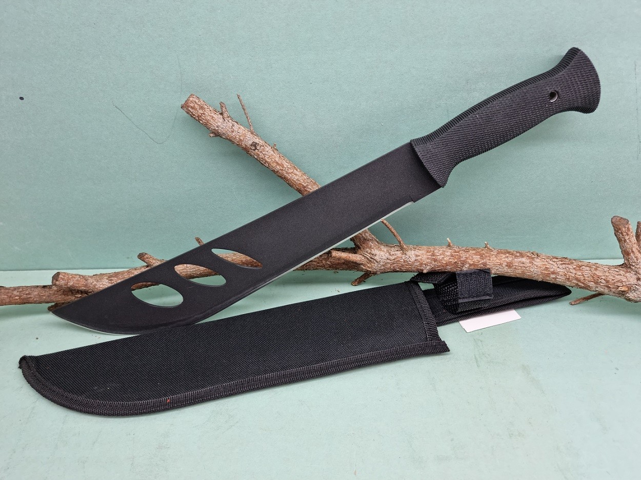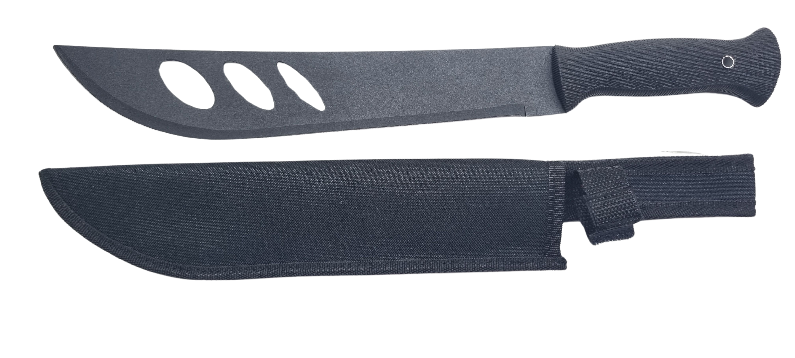 Kvalitná nerezová mačeta s gumenou rukoväťou a čepeľou potiahnutou čiernym teflónom. Na zavesenie mačety poslúži otvor na čepeli. Súčasťou je čierne textilné puzdro s možnosťou pripevnenia na opasok. Tovar je určený iba osobám starším ako 18 rokov!