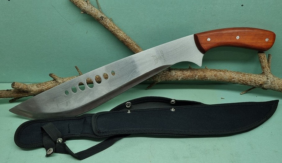 Praktická celokovová mačeta s hladkou nerezovou čepeľou a rukoväťou z dreva. Na zavesenie mačety poslúžia otvory na čepeli. Súčasťou je puzdro, ktoré je možné pripevniť na opasok. Mačeta je skvelá na preriedenie kríkov a konárov, kosenie vegetácie alebo kempovanie. Je to všestranný, efektívny a spoľahlivý nástroj do prírody. Rukoväť mačety je ergonomická, čo zaručuje bezpečné použitie. S mačetou zaobchádzajte opatrne, uchovávajte ju mimo dosahu detí a používajte iba na určené účely.Tovar je určený iba osobám starším ako 18 rokov!