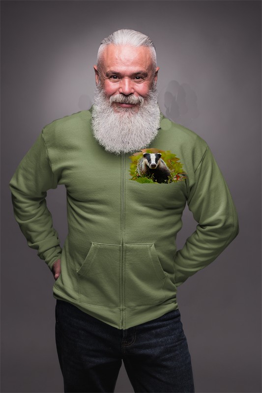 Klasická pohodlná mikina s potlačou , motív Jazvec, Vám zabezpečí prijemné nosenie v akomkoľvek počasí , je vhodná na bežné každodenné použitie a na všetky poľovnícke a outdoorové aktivity. Má rovný strih s bočnými švami, stojáčik a bočný diel z rebrového úpletu 2:2 s 5 % elastanu, celozapínací kostený zips, vrecko v štýle klokanky , dvojité prešitie okolo rukávov, spodného lemu a priekrčníku, ktoré sú z rebrového úpletu z 5 % elastanu. Vyrobená je z kvalitnej , zdravotne nezávadnej výplnkovej pleteniny 65% bavlna a 35% polyester , gramáž 300g / m2, vnútorná strana počesaná.