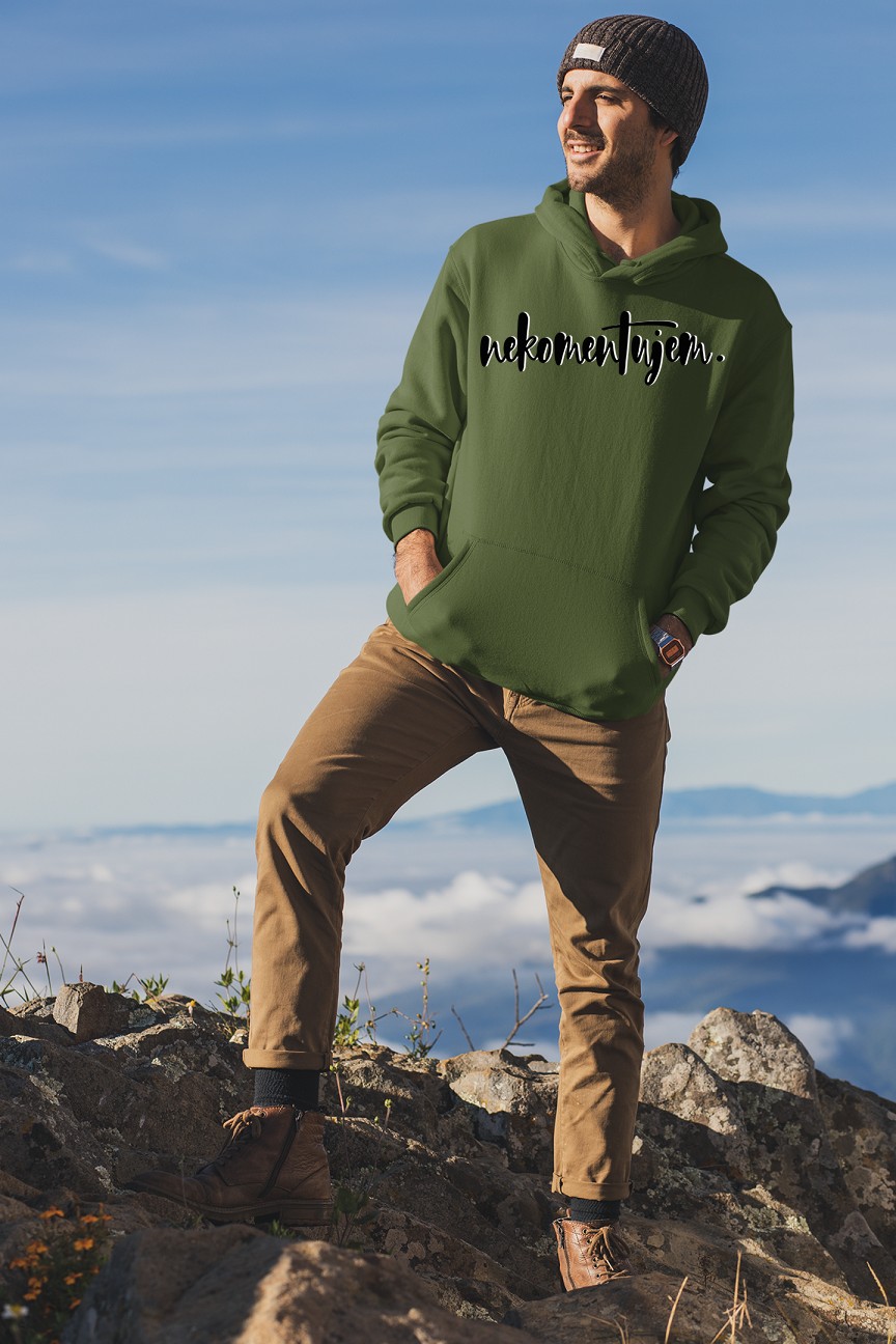 Klasická pohodlná mikina s kapucňou s vtipným motívom Nekomentujem, Vám zabezpečí prijemné nosenie v akomkoľvek počasí , je vhodná na bežné každodenné použitie a na všetky outdoorové aktivity. Má rovný strih s bočnými švami, kapucňa s podšívkou na stiahnutie šnúrkou, vnútorná časť priekrčníka začistená páskou vo farbe povrchového materiálu, vrecko v štýle klokanky ,dvojité prešitie okolo rukávov, spodného lemu a priekrčníku, ktoré sú z rebrového úpletu z 5 % elastanu. Vyrobená je z kvalitnej , zdravotne nezávadnej výplnkovej pleteniny 65% bavlna a 35% polyester , gramáž 320g/m2 , vnútorná strana počesaná .
