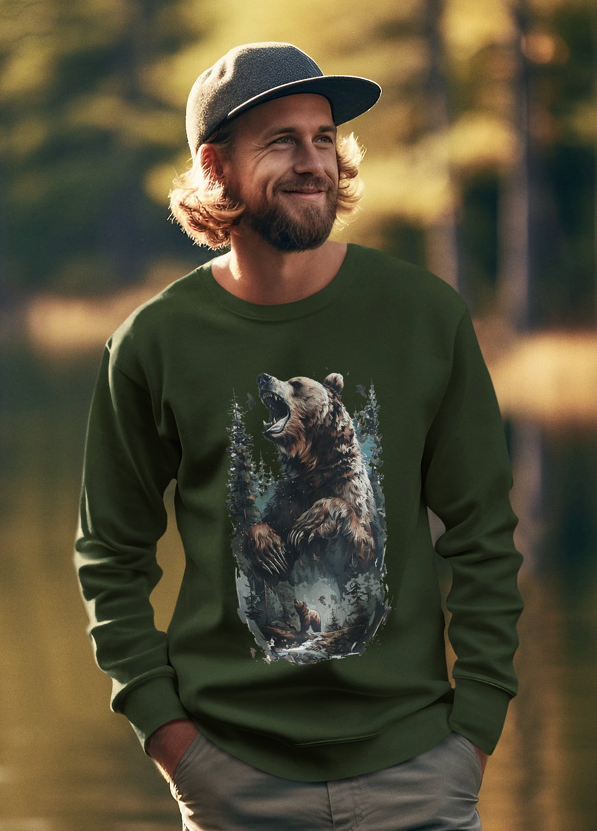 Štýlová, pohodlná a odolná mikina, ktorá poteší každého poľovníka, milovníka prírody či outdoorového nadšenca. V atraktívnej vojenskej (military) zelenej farbe s originálnym poľovníckym motívom Medveď, ktorý dotvára jedinečný charakter tohto kúsku. Mikina má rovný strih s bočnými švami pre pohodlné nosenie, manžety, dolný lem a priekrčník sú z rebrového úpletu 1:1 s prídavkom elastanu, vďaka čomu výborne sedia a držia tvar. Vnútorná počesaná strana zabezpečuje hrejivosť a príjemný pocit pri nosení aj počas chladných dní.