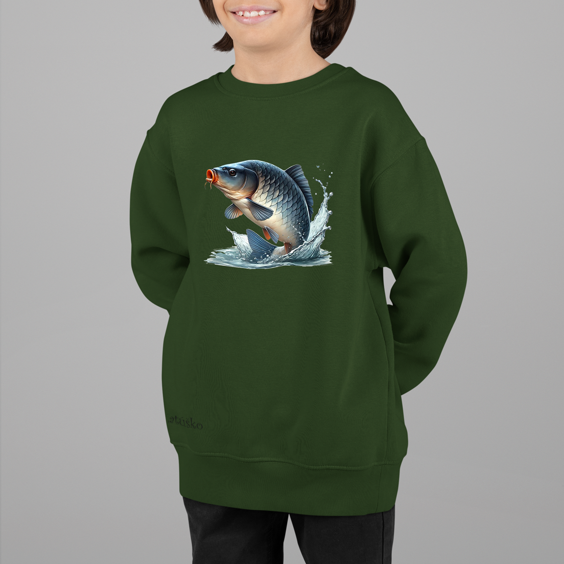 Klasická pohodlná detská mikina s rybárskym motívom poteší každé dieťa ktoré má rado prírodu, zabezpečí prijemné nosenie v akomkoľvek počasí a je vhodná na bežné každodenné použitie a na všetky aktivity. Má rovný strih s bočnými švami, dvojité prešitie okolo rukávov, spodného lemu a priekrčníku, ktoré sú z rebrového úpletu z 5 % elastanu. Vyrobená je z kvalitnej , zdravotne nezávadnej výplnkovej pleteniny 65% bavlna a 35% polyester , gramáž 300g / m2, vnútorná strana počesaná.