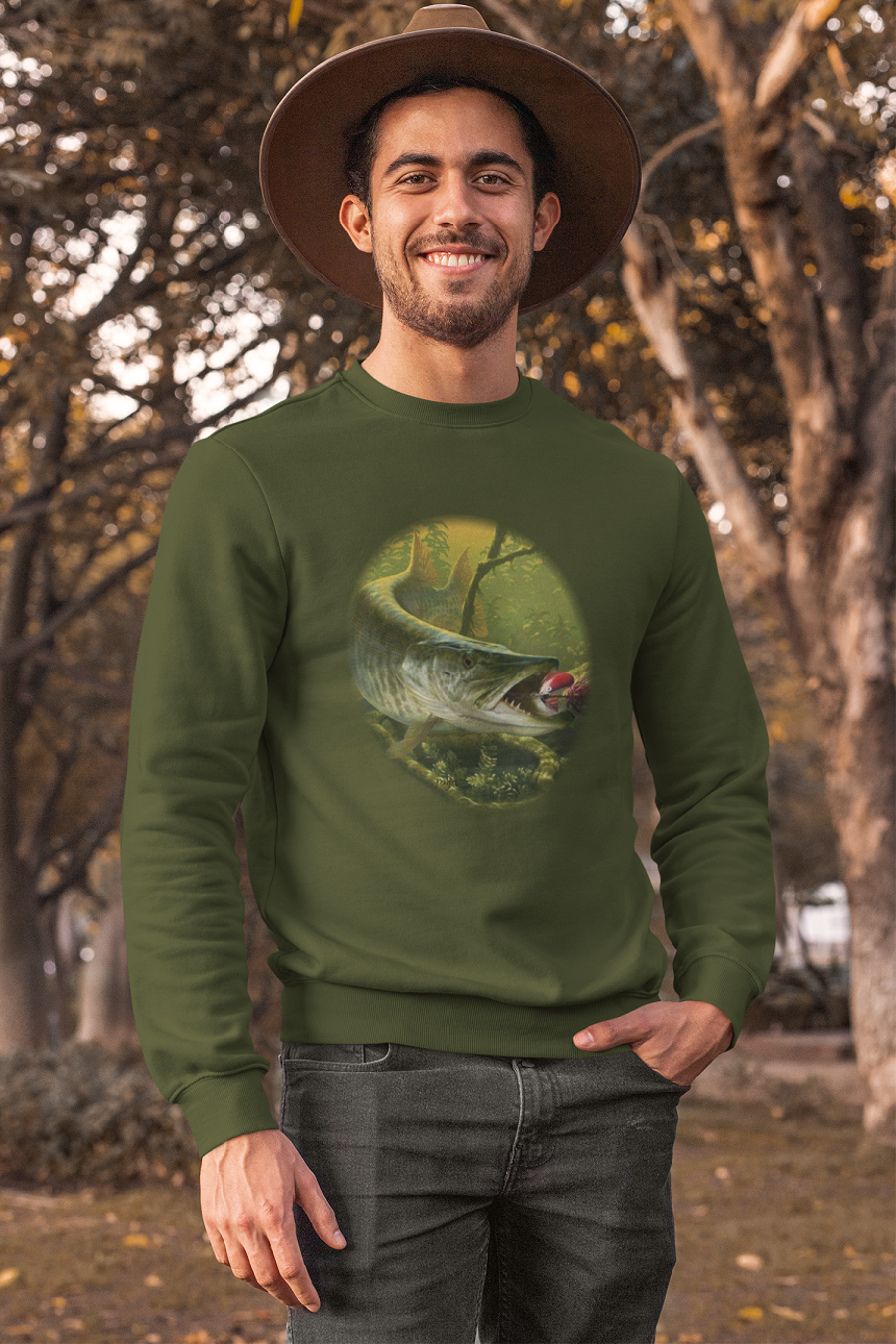 Úvod » Oblečenie » Pánske » Mikiny » Rybárska mikina » Mikina s rybárskym motívom Šťuka zelené pozadie FŠ5