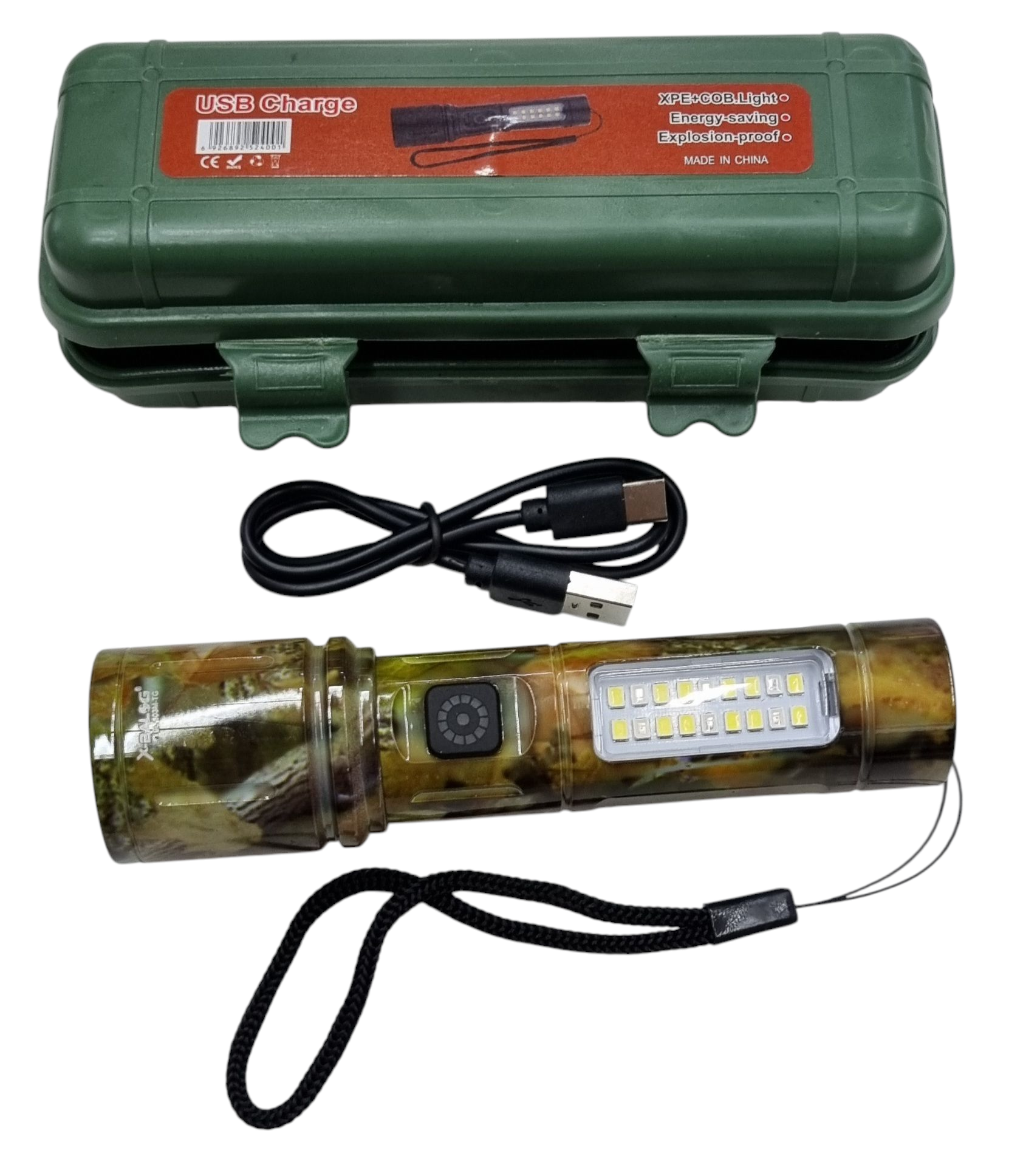 Multifunkčná baterka 2 reflektory - hlavný reflektor s funkciou ZOOM je určený pre bežné svietenie a bočný COB reflektor využijete k osvieteniu priestoru. Bočné svetlo svieti aj červeným stálym svetlom, alebo blikajúcim. Vďaka jeho malým rozmerom sa zmesti do vrecka. Súčasťou je aj plastový box na uskladnenie. Baterka má aj šnúrku , môžete si ju upevniť na ruku. Nabíjanie sa vykonáva pomocou priloženého USB kábla. Dobíjací konektor je umiestnený v zadnej časti. Dĺžka: 14cm.
