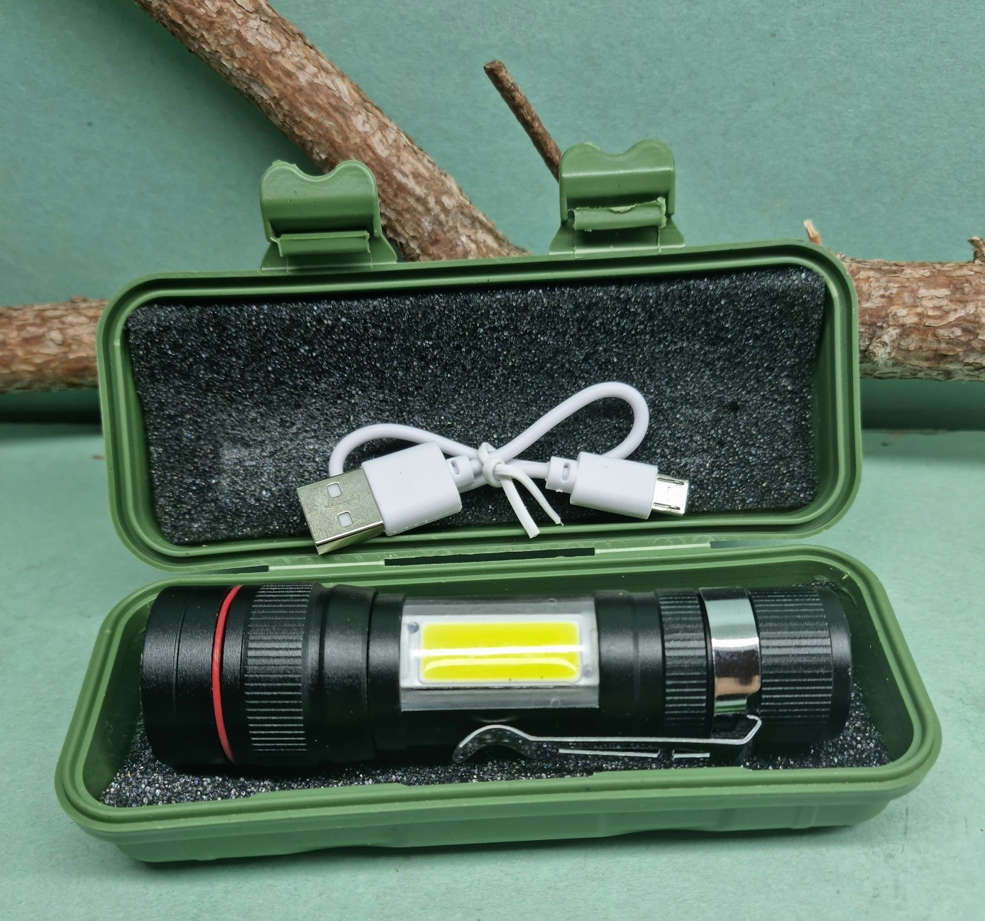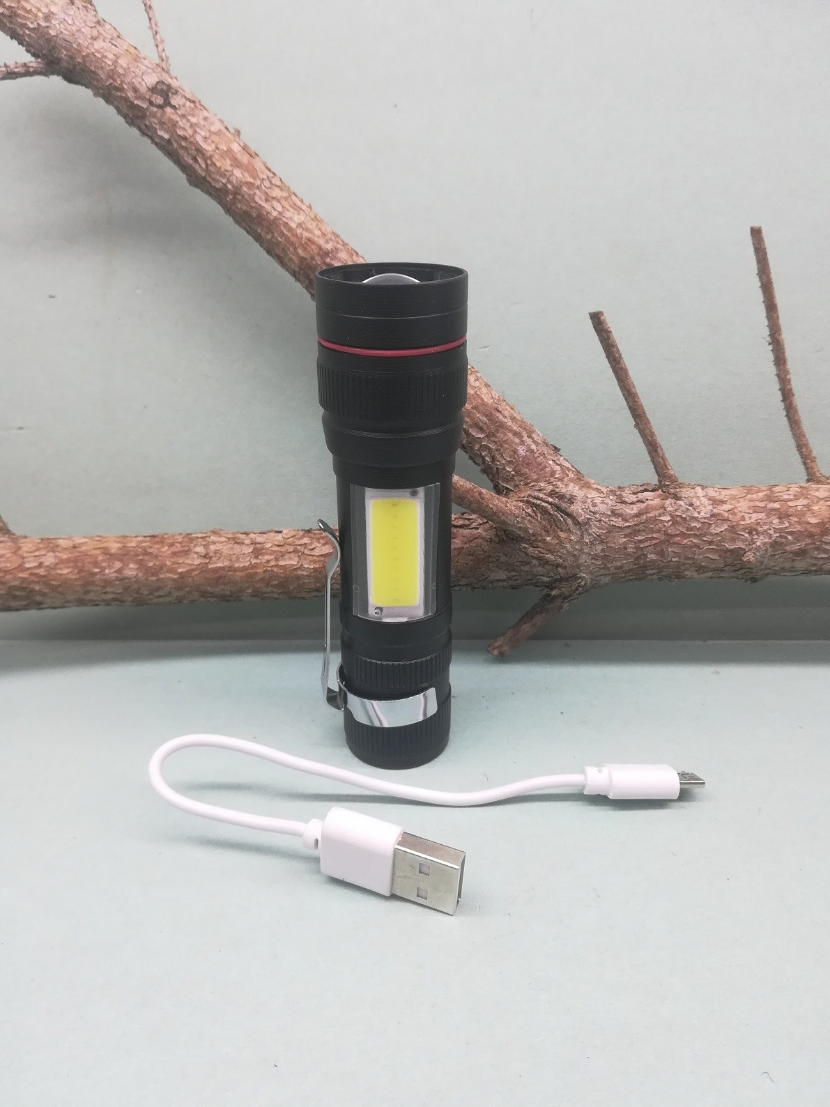 Multifunkčná mini baterka, 2 reflektory - hlavný reflektor s funkciou ZOOM je určený pre bežné svietenie a bočný COB reflektor využijete k osvieteniu priestoru. Vďaka jeho malým rozmerom sa zmesti do vrecka a s klipom sa jednoducho zavesí na oblečenie. Nabíjanie sa vykonáva pomocou priloženého USB kábla. Dobíjací konektor je umiestnený v zadnej časti pod gumovým krytom. Dĺžka: 10 cm.